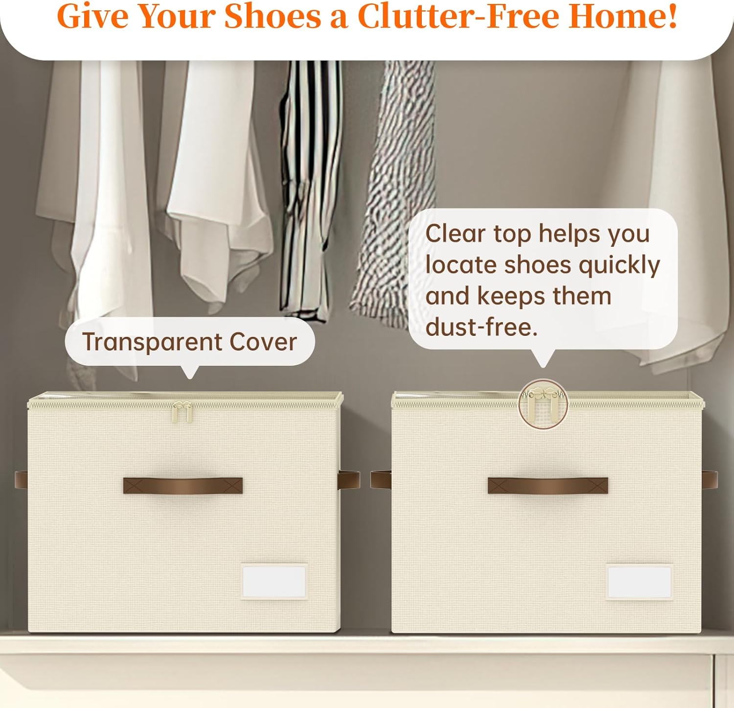 - 【Large Shoe Storage Organizer】: These shoe storage containers let you store shoes neatly and efficiently. Shoes are all vertical and compact inside, much more space saving than those plastic shoe bins. Perfect for storing various kinds of shoes such as sneakers, sandals, loafers, canvas boot, high-tops, etc.. The foldable design enables space-saving when the shoe storage bins are not in use.Shoe Organizer for Closet, Beige, 3 Pack