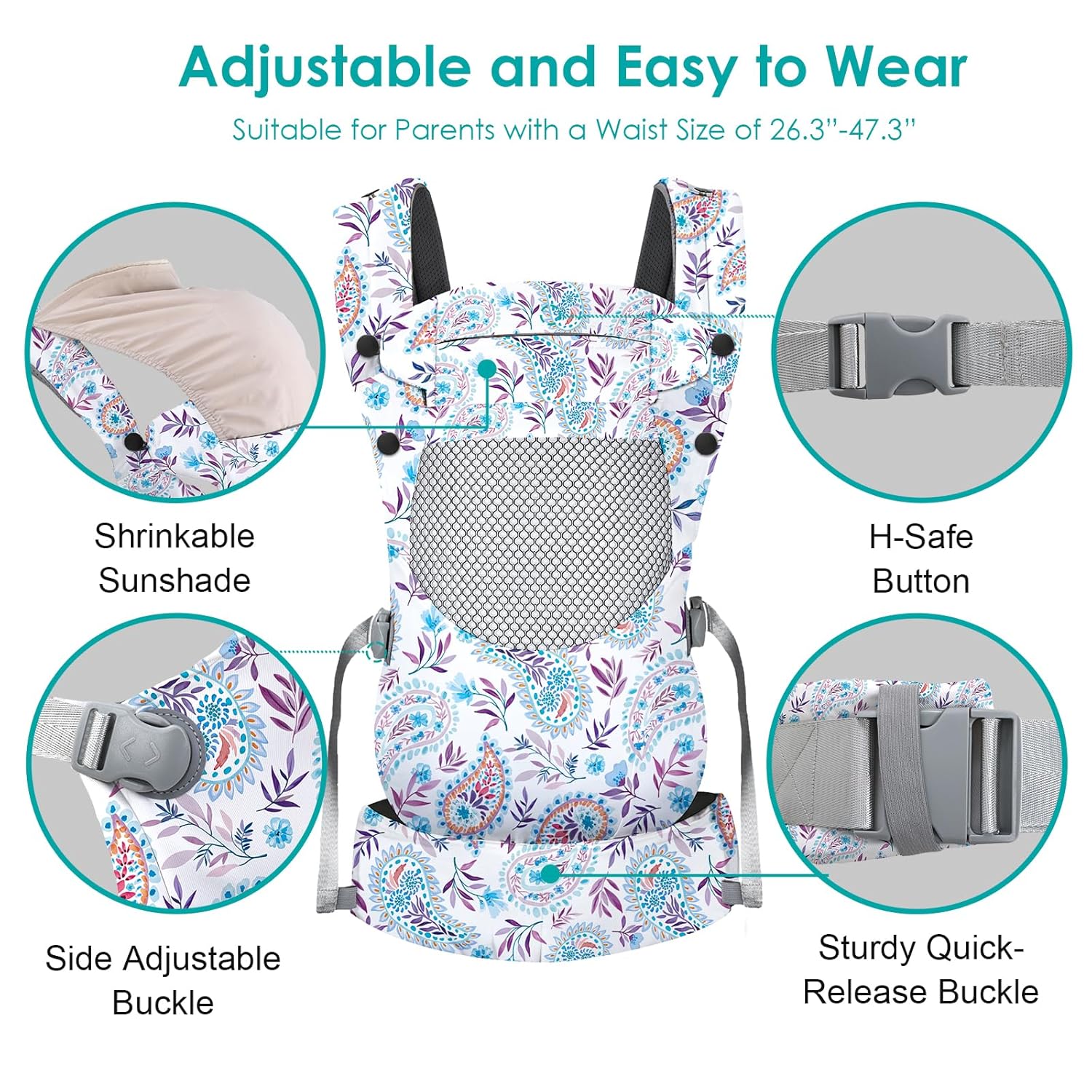 - Adjustable & Easy to Wear: These baby carriers are designed with an adjustable size, suitable for parents with a waist 26.3"-47.3"(67-120 cm). The sturdy quick-release buckle combined with the cross back “X” buckle makes it safe and easy to use. Suitable for babies from 7-66 lbs(3-36 months)