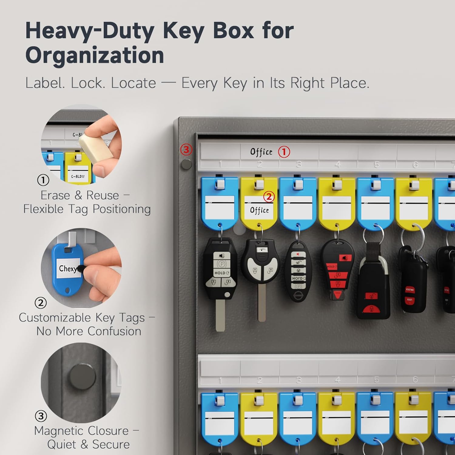 - Efficient Hook Layout: Keys and Key tags are organized without overlap, making labels easy to read. Each hook has a marking area where key locations can be labeled with a marker, allowing keys to be returned to designated spots for easy management.