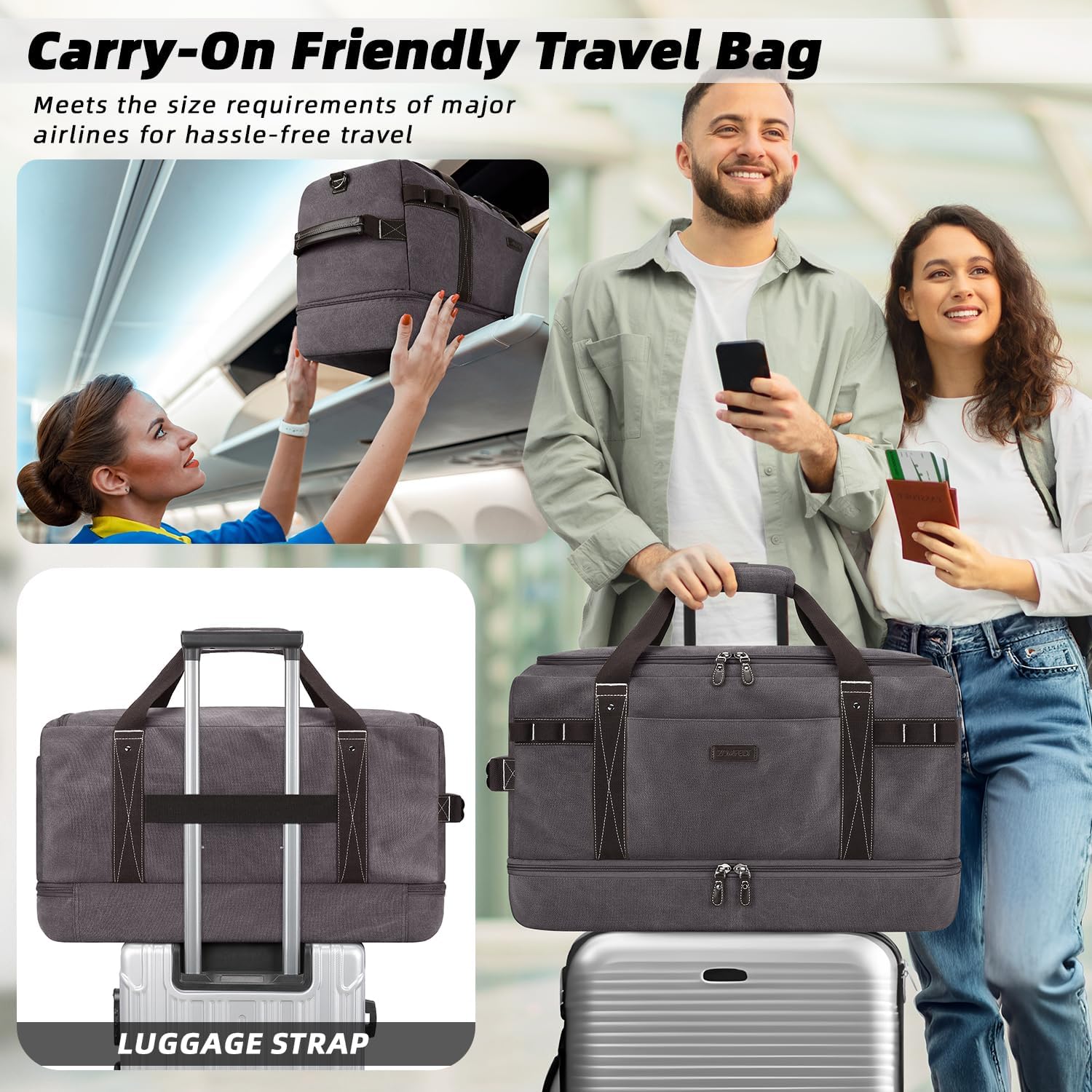 ZOMFELT Travel Duffle Bag for Men Women, Waterproof Canvas Overnight Duffel Bag with Removable Dividers & Shoe Compartment, Carry On Weekender Gym bag, Multi-Pocket & Vintage Design (Washed Grey)