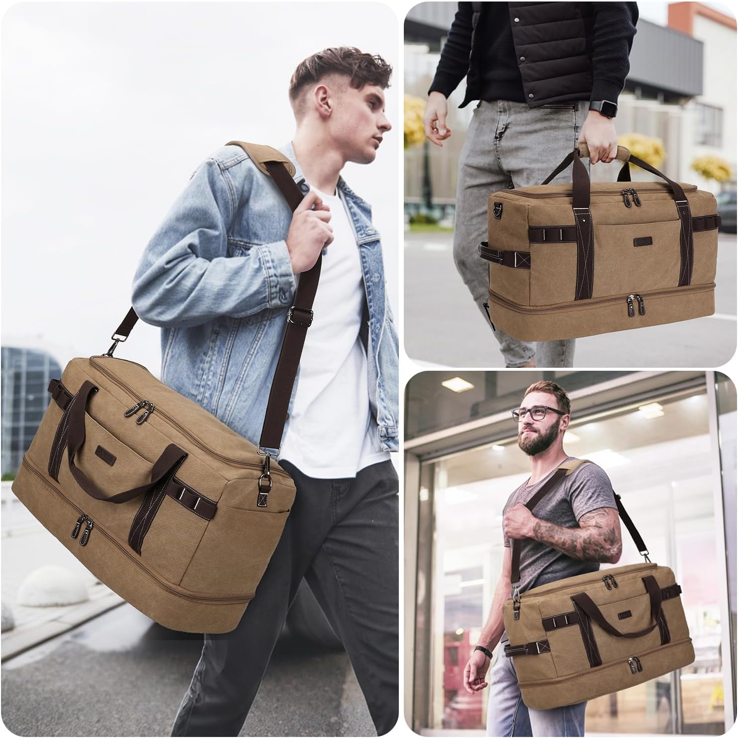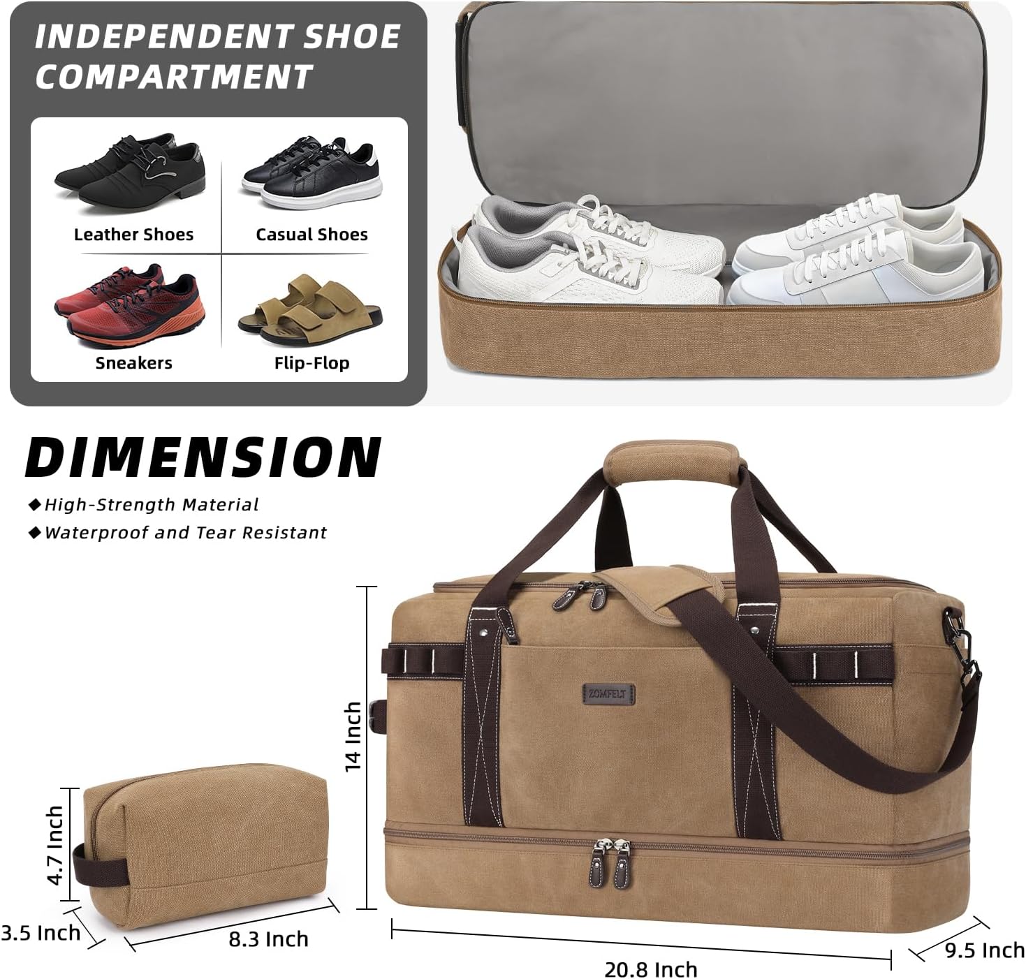 ZOMFELT Travel Duffle Bag for Men, Waterproof Canvas Overnight Duffel Bag with Removable Dividers & Shoe Compartment, Carry On Weekender Gym bag, Multi-Pocket & Vintage Design (Washed Brown)