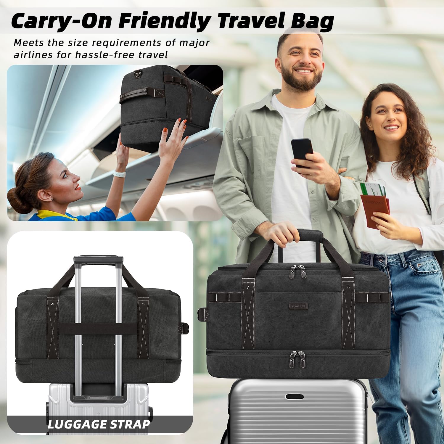 ZOMFELT Travel Duffle Bag for Men, Waterproof Canvas Overnight Duffel Bag with Removable Dividers & Shoe Compartment, Carry On Weekender Gym bag, Multi-Pocket & Vintage Design (Washed Black)