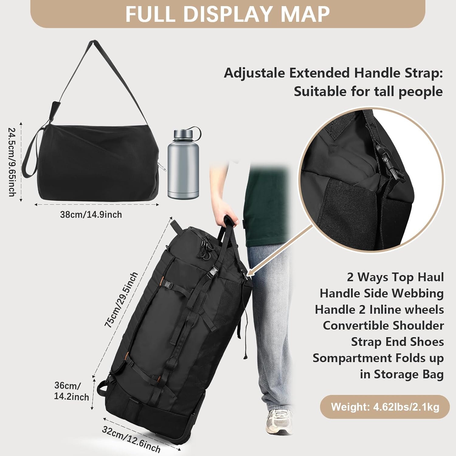 Rolling Duffle Bag with Wheels,86L 30”Folding Duffle Backpack with 2 Wheels,Travel Bag with Separate Shoe Compartment,Black