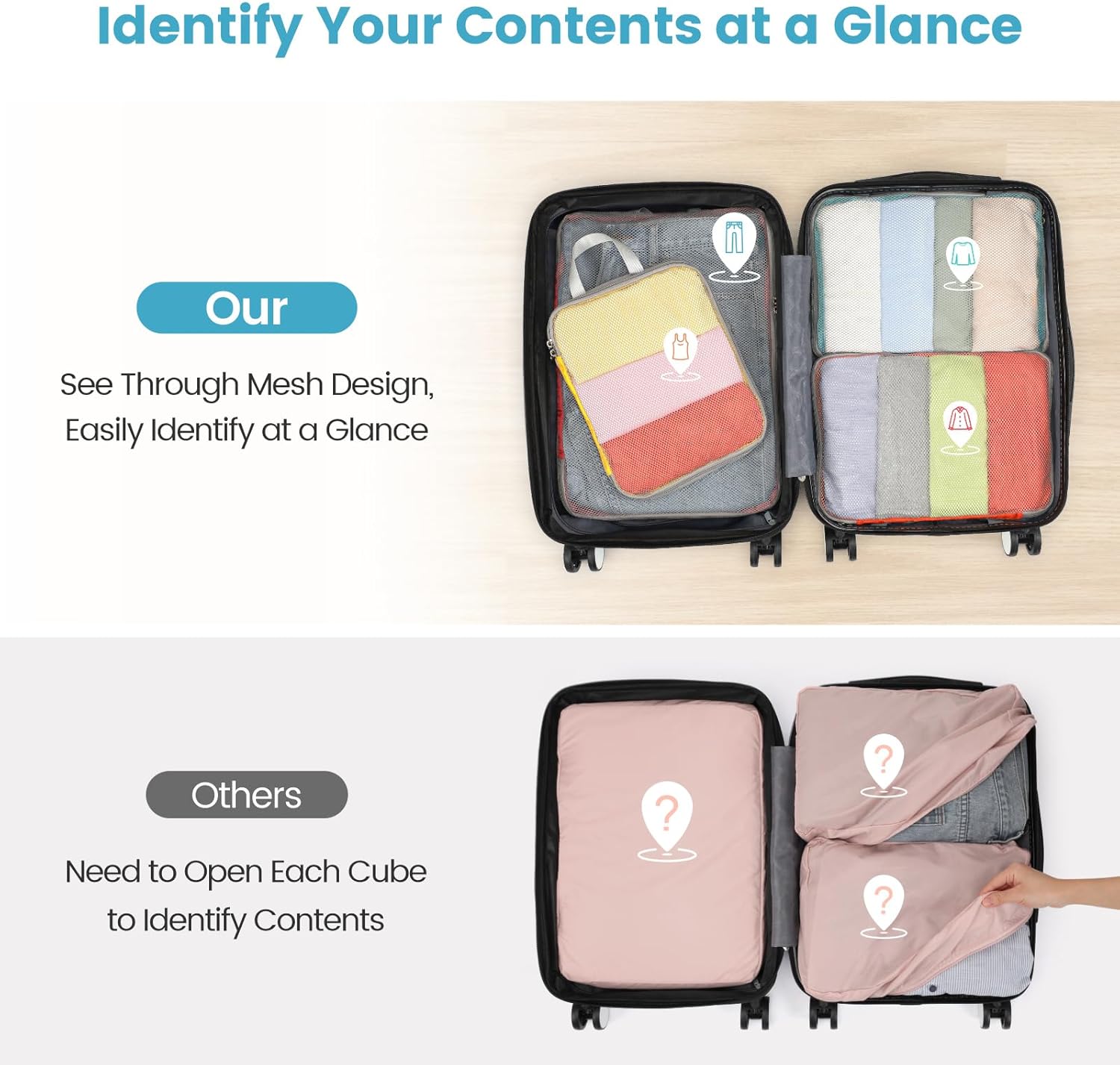 - Easy to Find What You Need: This compression packing cubes travel features a see through mesh and multi-color design, which helps to quickly find what you need. TSA-friendly mesh allows quick inspection without unzipping - keeps contents visible and secure