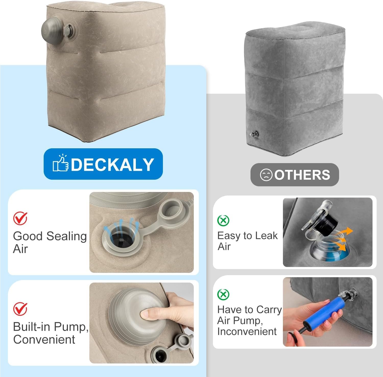 - 【EASY INFLATION & DEFLATION】 because of the upgrade design of attaching pump the pillow, our airplane footrest pillow can be inflated and deflate quickly with hand pressing in 1 minutes, no more blowing by mouth or using separate air pump!