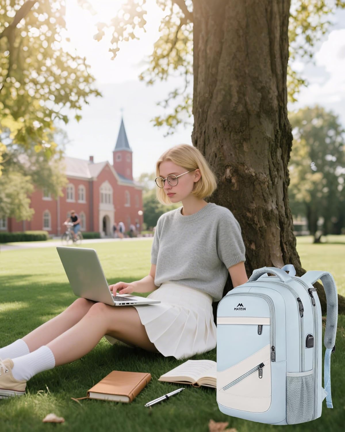 MATEIN Large College Laptop Backpack, Water Resistant Nurse Travel Backpack with USB Charging Port TSA Approved, Soft Anti Theft Comupter Bag for Work, Blue Beige
