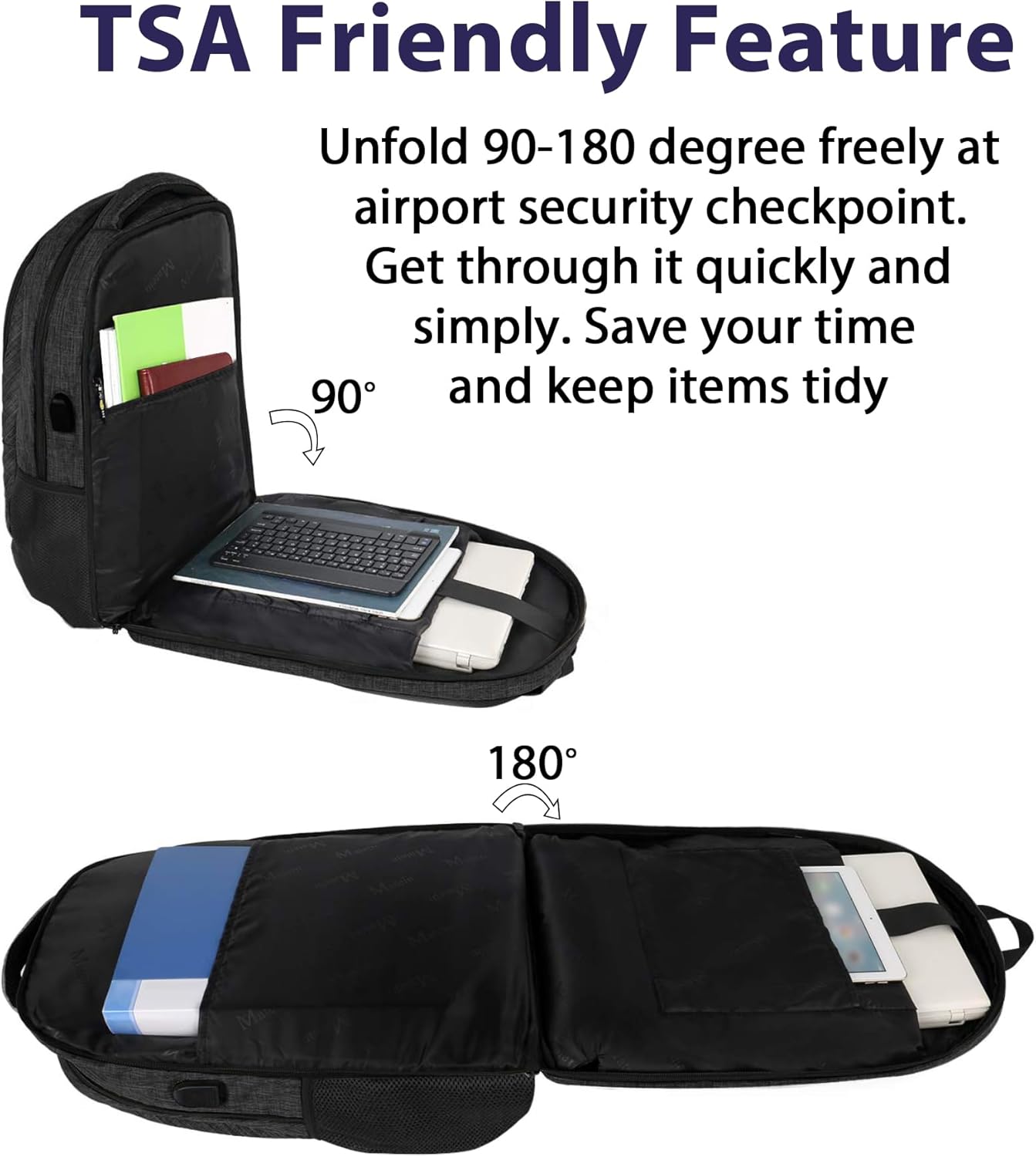 - TSA Approved Backpack: Laptop compartments' tsa function is designed for airplane flight travel. The laptop travel backpack can unfold 90 to 180 degrees, making the laptop backpack 17 inch get through airport security checkpoint more easily and quickly. This mens laptop backpack is large enough for daily office work, business travel, weekend getaway, overnight trip, college school