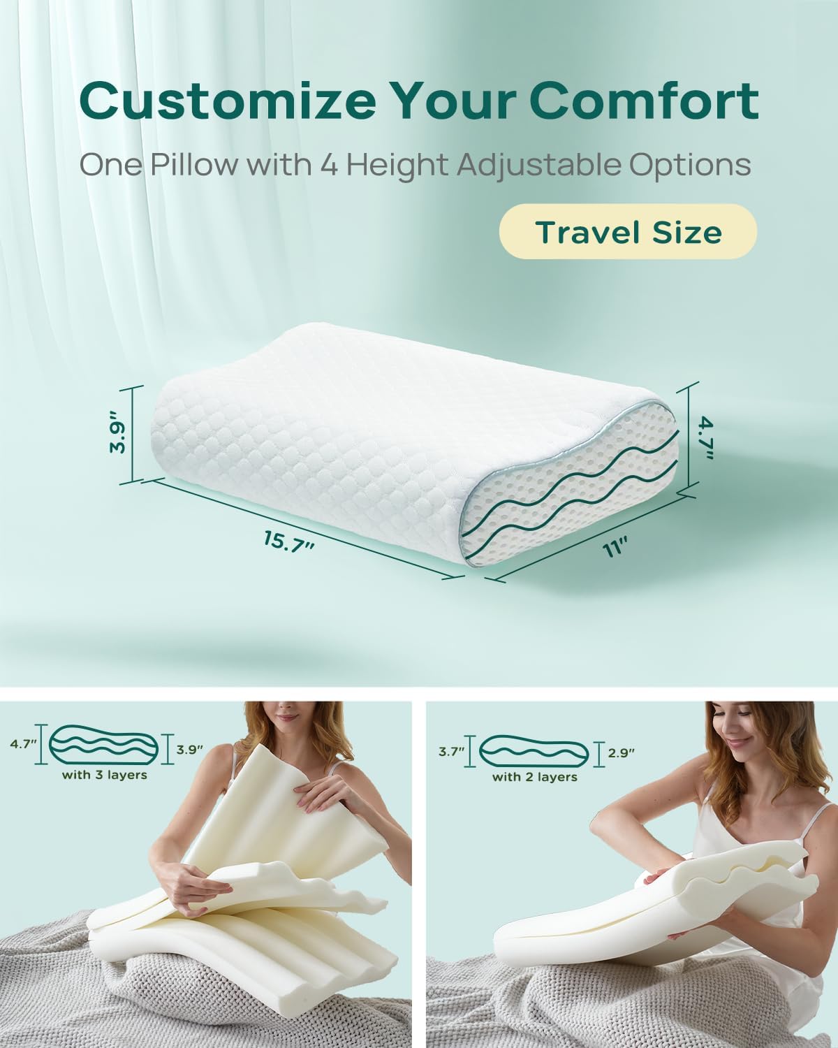 - ❇️【4 Available Heights】- Customize your ideal support with 4 adjustable height options - simply remove or reinsert the middle layer to switch between high contour (4.7"/3.7") and low contour (3.9"/2.9") settings, allowing you to perfectly match the pillow's thickness to your preferred sleeping position for optimal spinal alignment and pressure relief