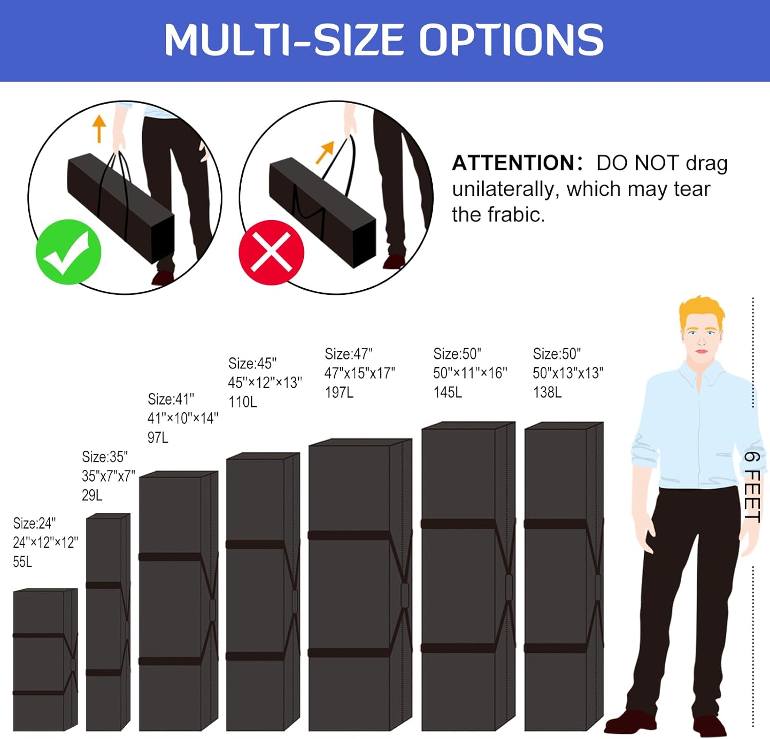 - LARGE CAPACITY: INFANZIA large-capacity duffle bag is one of the essential items for your travel. It can be used to store tents, clothing, sports equipment or foldable strollers. INFANZIA travel bags are available in 41*10*14 Inch/104*26*36 CM size to meet your travel needs