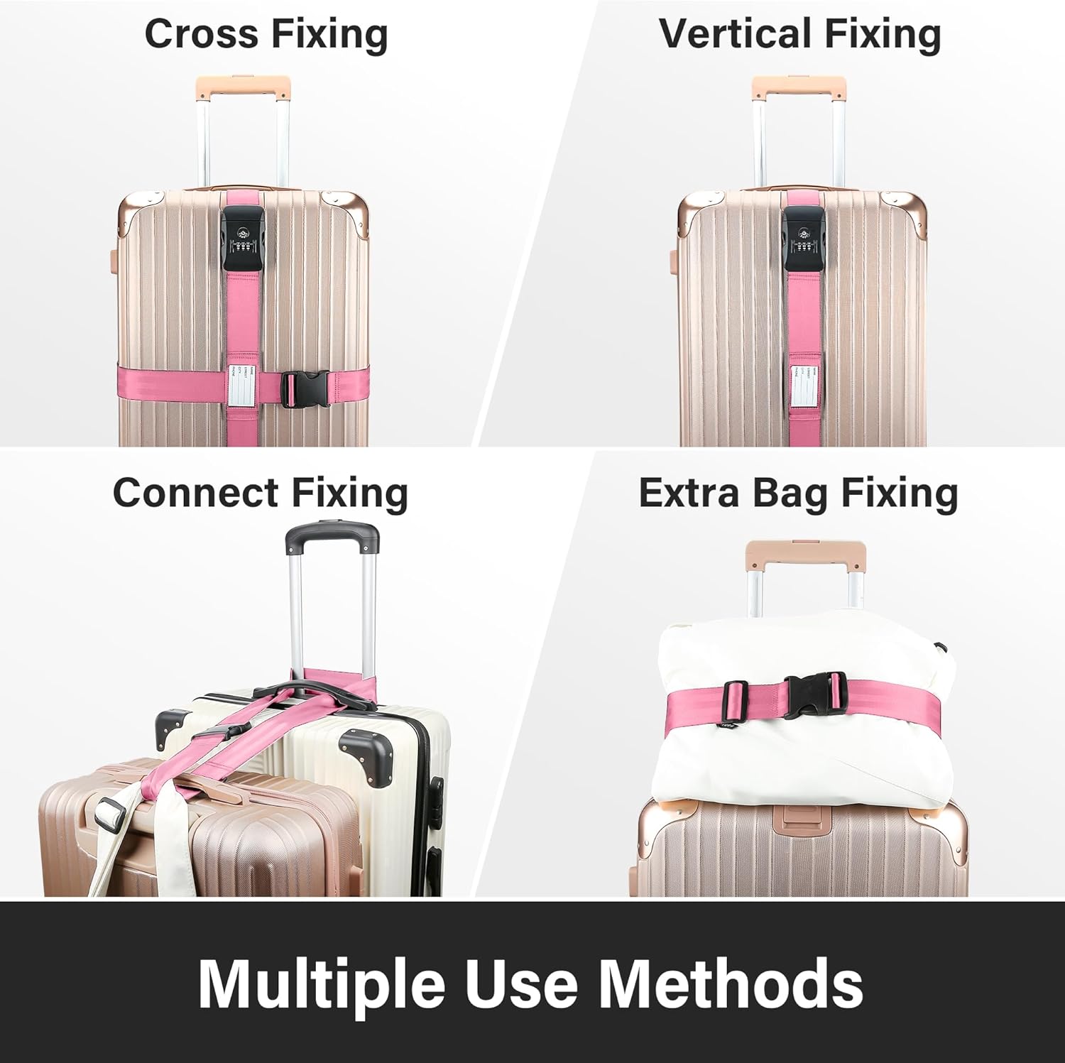 - Multifunctional TSA Approved Suitcase Straps – Whether you need to secure your luggage vertically, horizontally, or crosswise, this adaptable luggage belts for suitcases offer multiple ways to keep your suitcases safe. The luggage belt with buckle is also perfect for carry on bags, making travel more convenient.