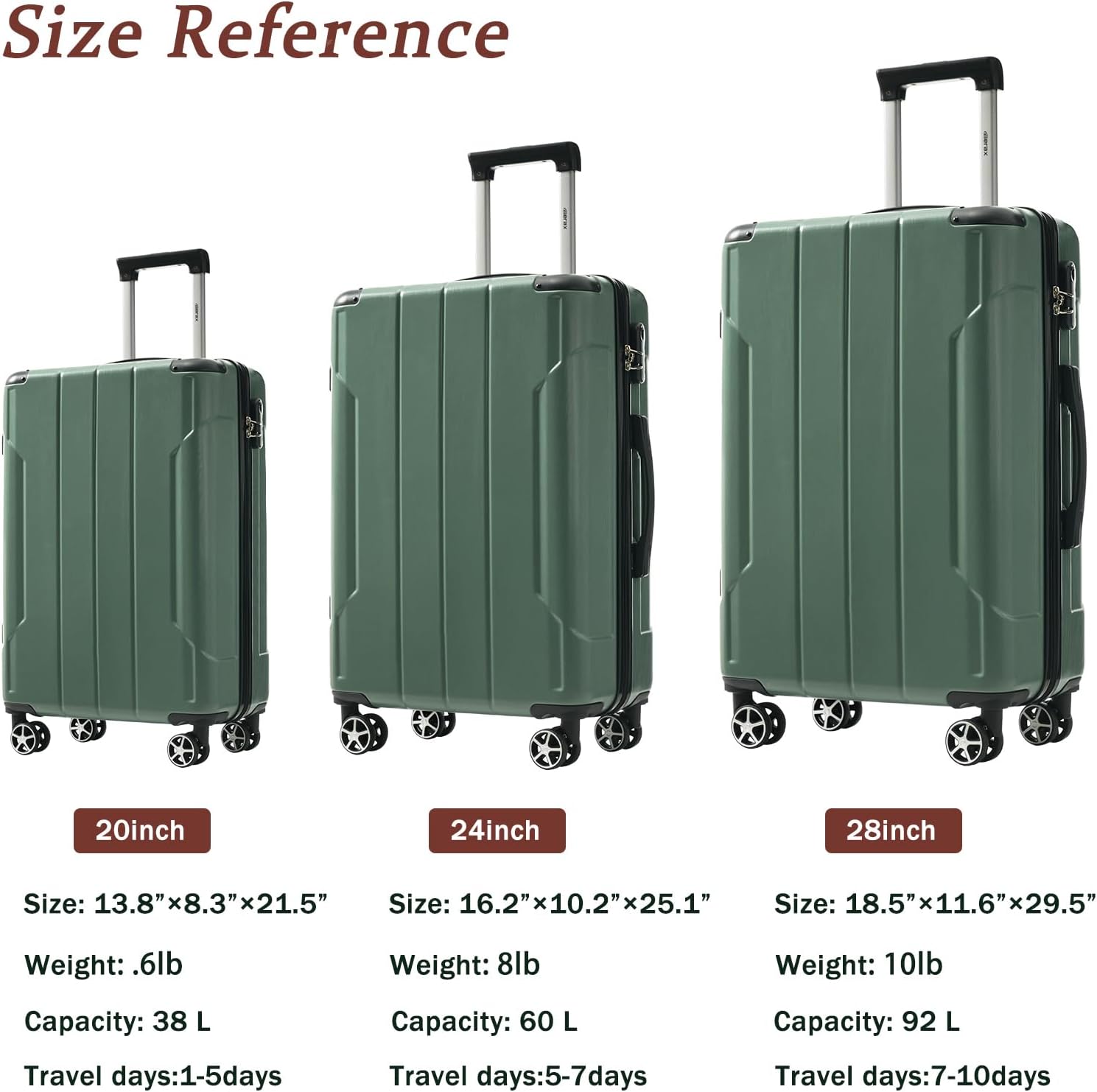 - [Meet All Your Needs] 20" (13.8×8.3×21.5 inches) – Complies with most airline carry-on requirements. 24" (16.2×10.2×25.1 inches) – The ideal mid-size solution for getaways. 28" (18.5×11.6×29.5 inches) – Maximum capacity for extended journeys.