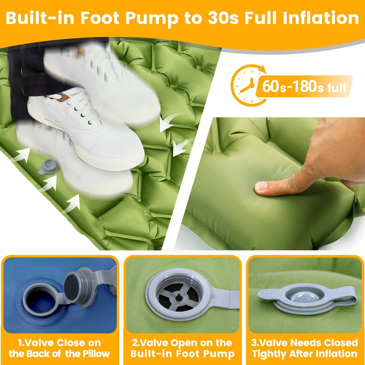 - 2. 60s Inflation Full & 1s Deflation & 24-Hour Air Keep. Single-foot pump fills the camping mattress pad in 60 seconds (tested to be 5x+ faster than hand or mouth pump style). Inflation method: Open the inflation valve, one foot steps on it, and by continuously stepping down and lifting your foot, allow air to enter the sleeping pad, achieving rapid inflation. Saves effort and protects your back. No-leak valve design keeps the inflatable sleeping pad fully inflated for 24 hours—no need to refill at night. Sleep uninterrupted. Open the valve on the camping sleeping mat back, and air instantly escapes.