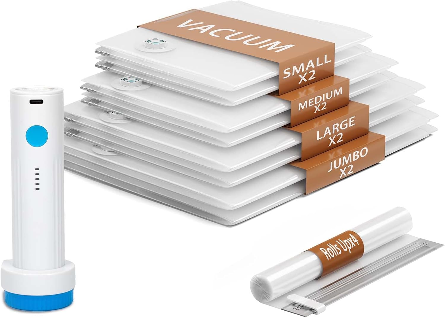 12 Pack Vacuum Storage Bags,Space Saver Bags for Clothing,Comforters,and Bedding,Includes 2 Jumbo, 2 Large, 2 Medium, 2 Small/4 Roll Bags,Compression for Closet & Travel, With Electric Pump
