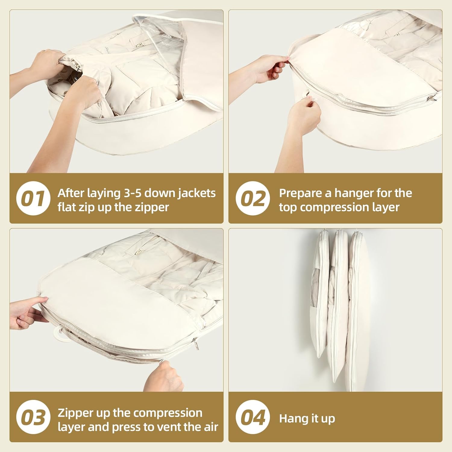 2 Packs Space Saving Garment Bag with Self Compression Zipper,Travel Suit Bags for Closet Storage, Hanging Garment Bag for Coats, Down Jackets (Large, Beige)