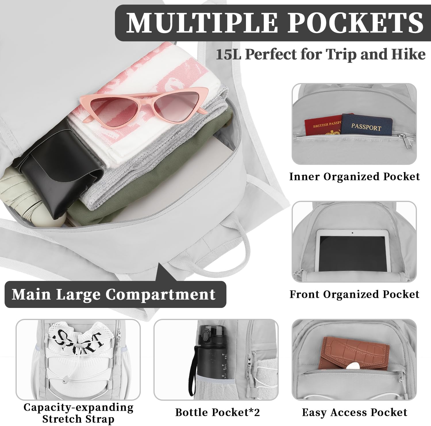 - Compact Yet Spacious: This hiking backpack for women combines minimal size with maximum practicality. The 15l main compartment and zippered interior pocket can hold your travel and hiking essentials. Two quick-access front zippered pockets hold your phone, portable charger and more. Two side pockets can easily accommodate large water bottles and umbrellas. An elastic drawstring stores items such as hats or sports protective gear