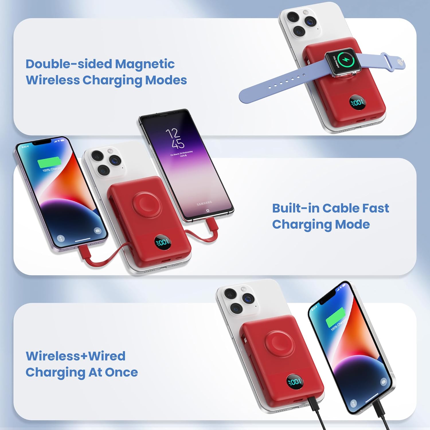 - 【6 Outputs & 2 Inputs,6 Devices Fast Wireless & Wired Charging】6-in-1 portable power bank features dual magnetic wireless charging(7.5W+3W),built-in iOS(18W)+Type-C(25W) charging cables,2 USB ports(25W USB-C+18W USB-A),total 6 outputs can charge 6 devices simultaneously.Multiple output modes seamlessly compatible with almost all iPhone,iPad,Samsung,Moto,LG and more Android devices,no need to carry extra cables.USB-C port and Type-C cable support input/output,two ways to fast recharge in 3-5hrs.