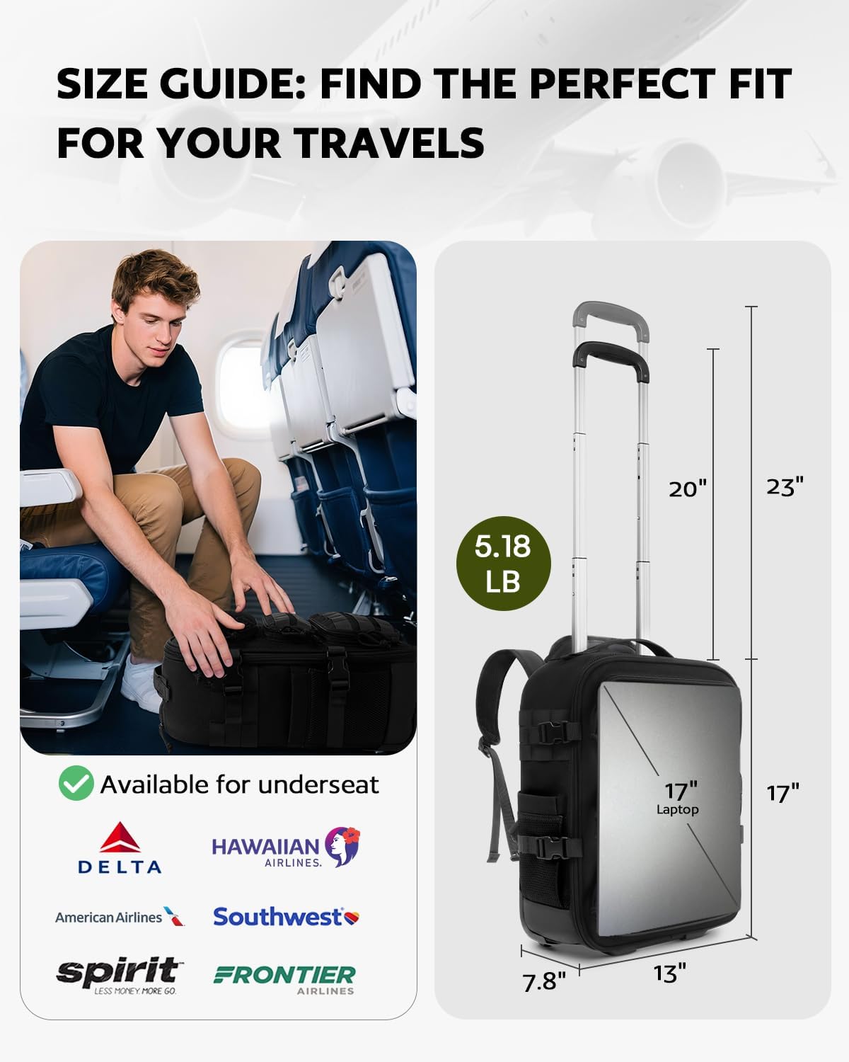 • 【Fly Easy — Airline-Compliant, TSA-Friendly】Sized at 13×17×7.8 inches, this roller backpack fits most airline carry-on and underseat requirements, making it ideal for frequent flyers. Designed to open 180° flat, it’s TSA-friendly—no need to remove your laptop at checkpoints. Travel smarter with this backpack on wheels and breeze through terminals with ease
