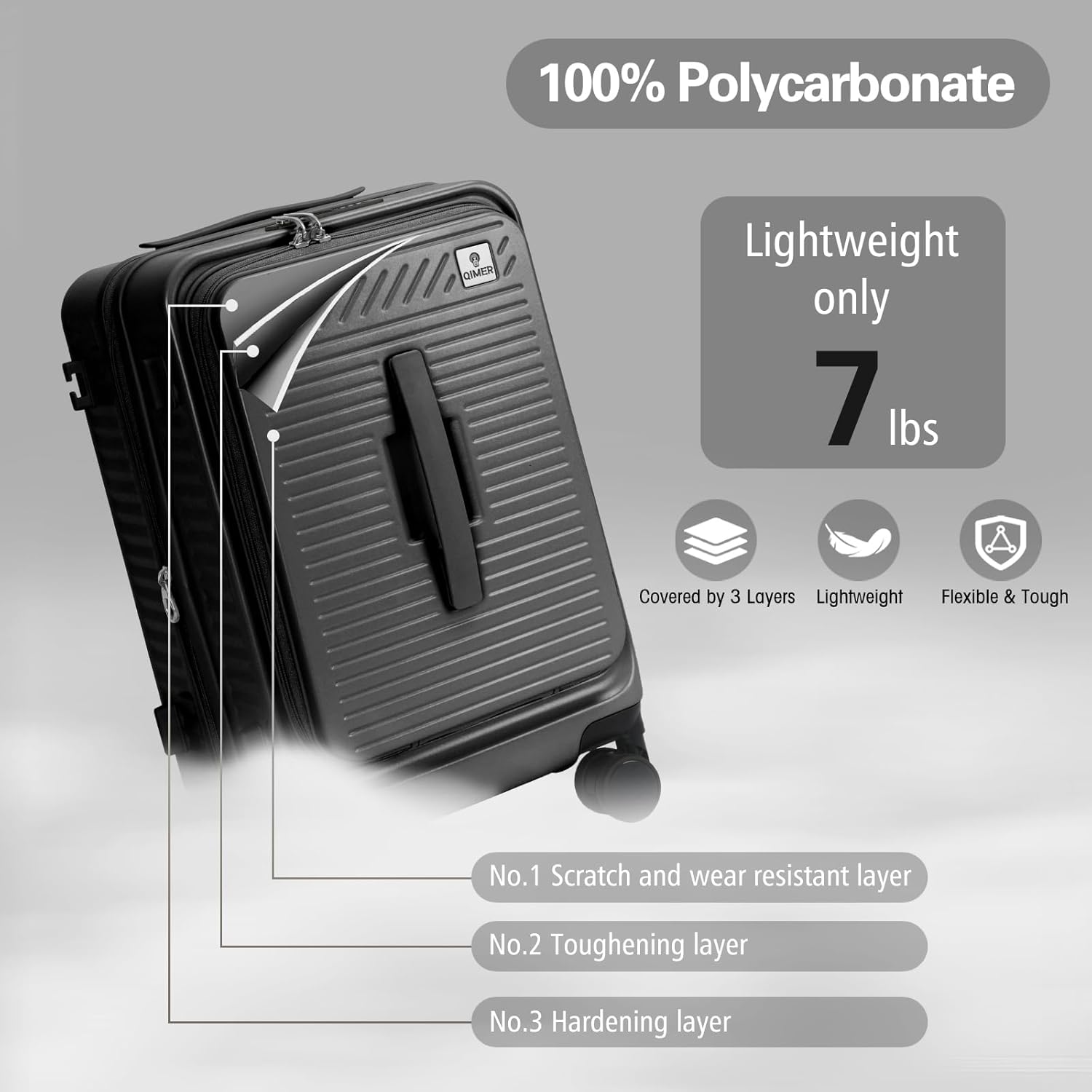 - Front-Opening Suitcase: This hardshell suitcase with wheels features a front-opening design. The front compartment includes a 15.6-inch laptop compartment, a zippered compartment, and a mesh pocket for space-saving access. Effortlessly open and close your suitcase like never before!