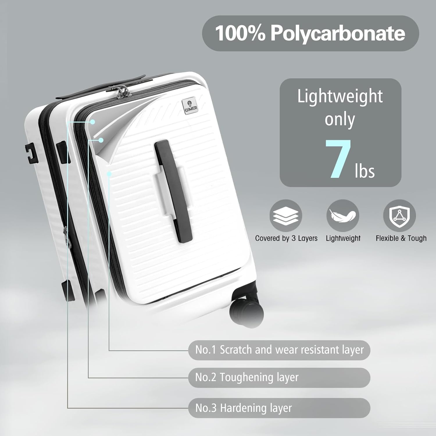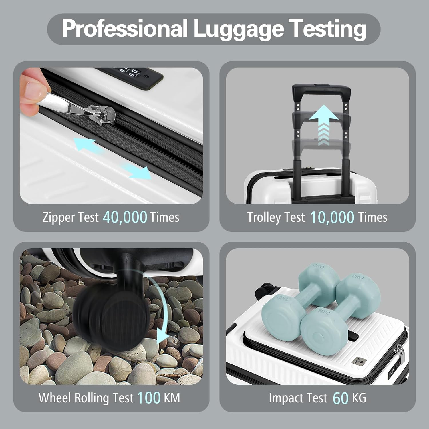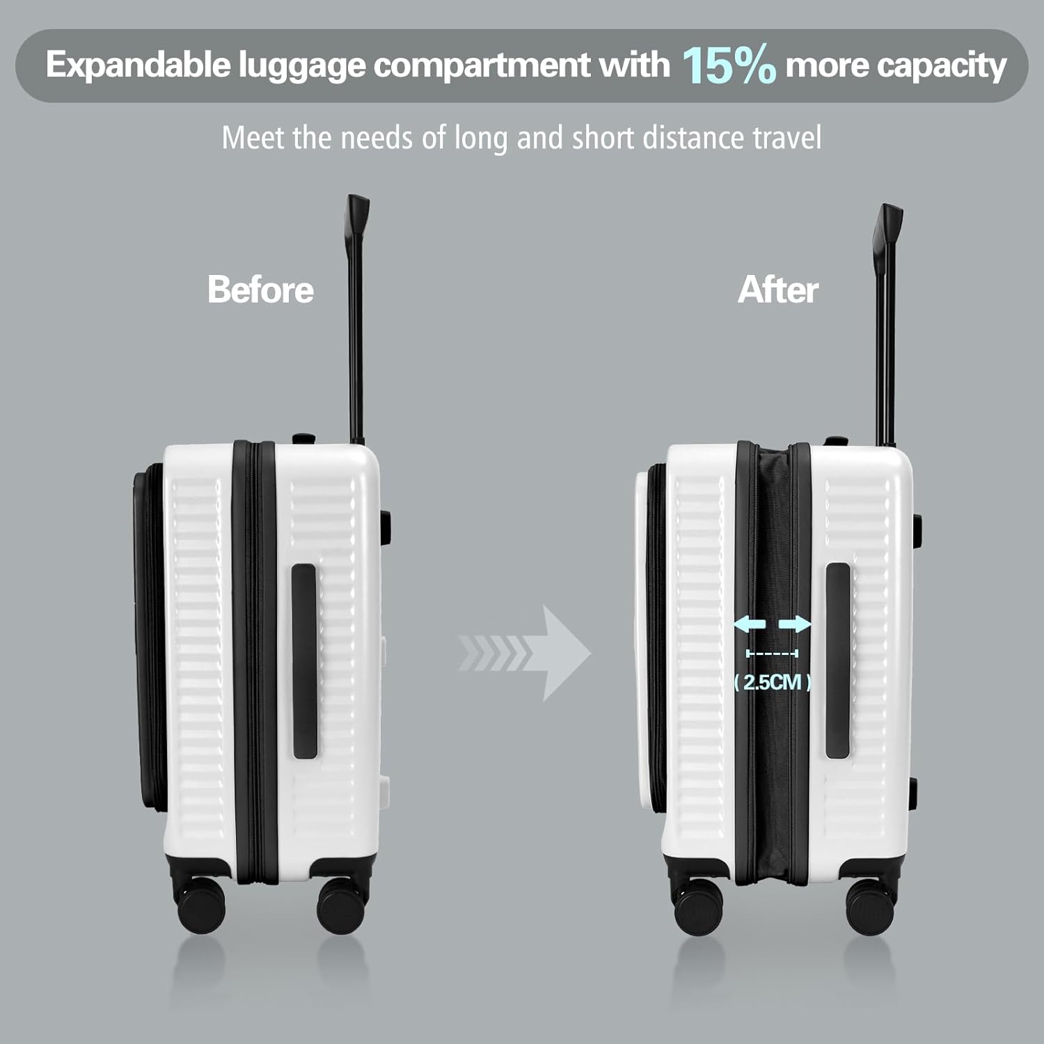 • Front-Opening Suitcase: This hardshell suitcase with wheels features a front-opening design. The front compartment includes a 15.6-inch laptop compartment, a zippered compartment, and a mesh pocket for space-saving access. Effortlessly open and close your suitcase like never before!