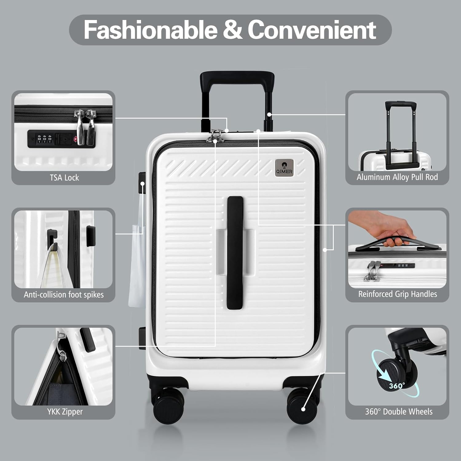 • Expandable Capacity: QIMER suitcase features a zippered expansion mechanism that expands, providing 15% more storage space. Dimensions: 21.06 x 13.58 x 11.02 in (Expanded: 21.7 x 13.58 x 12.52 in). Effortlessly fit in those extra souvenirs or travel essentials, making the most of every journey.