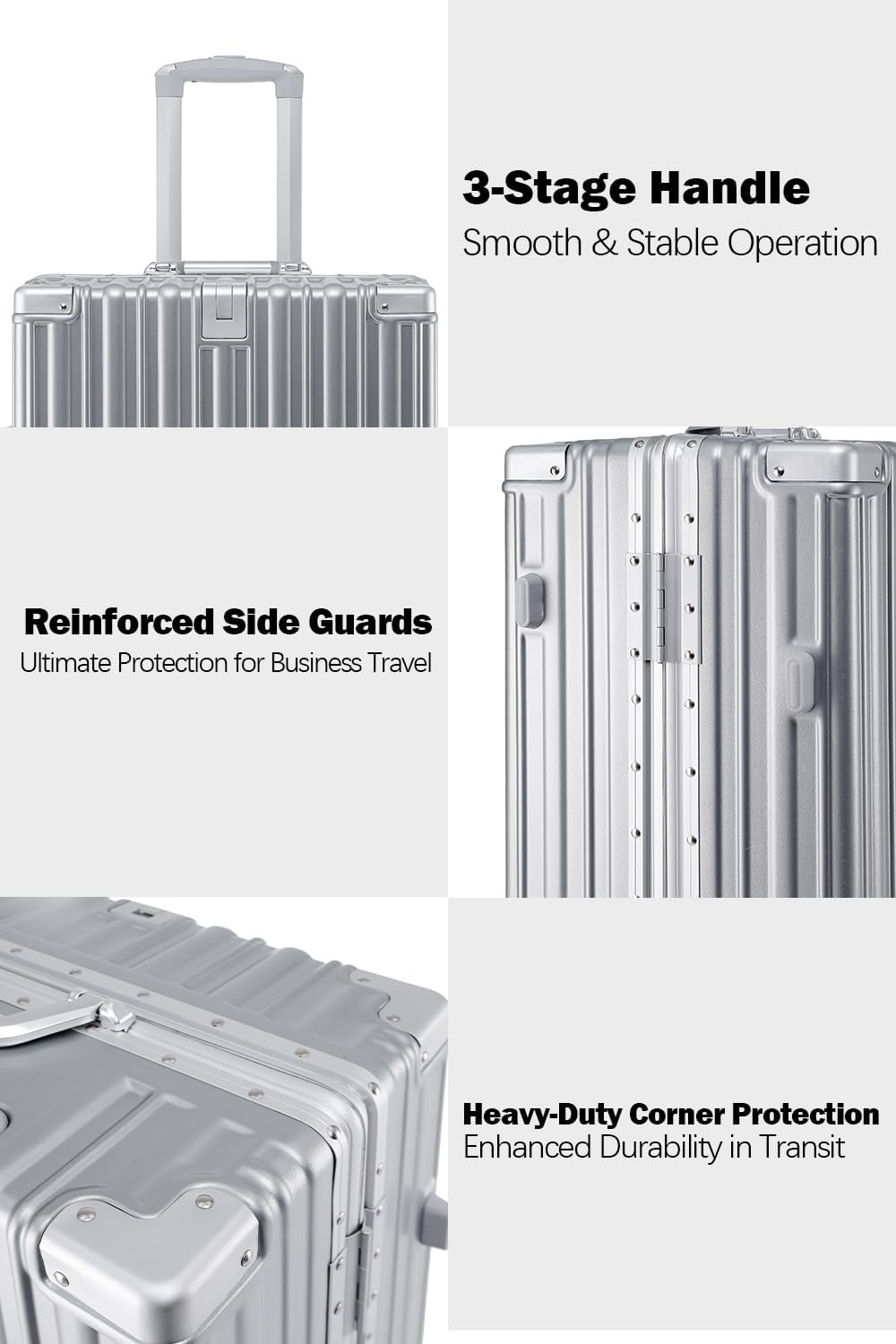 - SECURE ALUMINUM FRAME: Say goodbye to broken zippers with our zipperless hard shell luggage. Featuring a sturdy aluminum frame and easy-to-use latches, this suitcase offers better security and smoother access to your belongings.