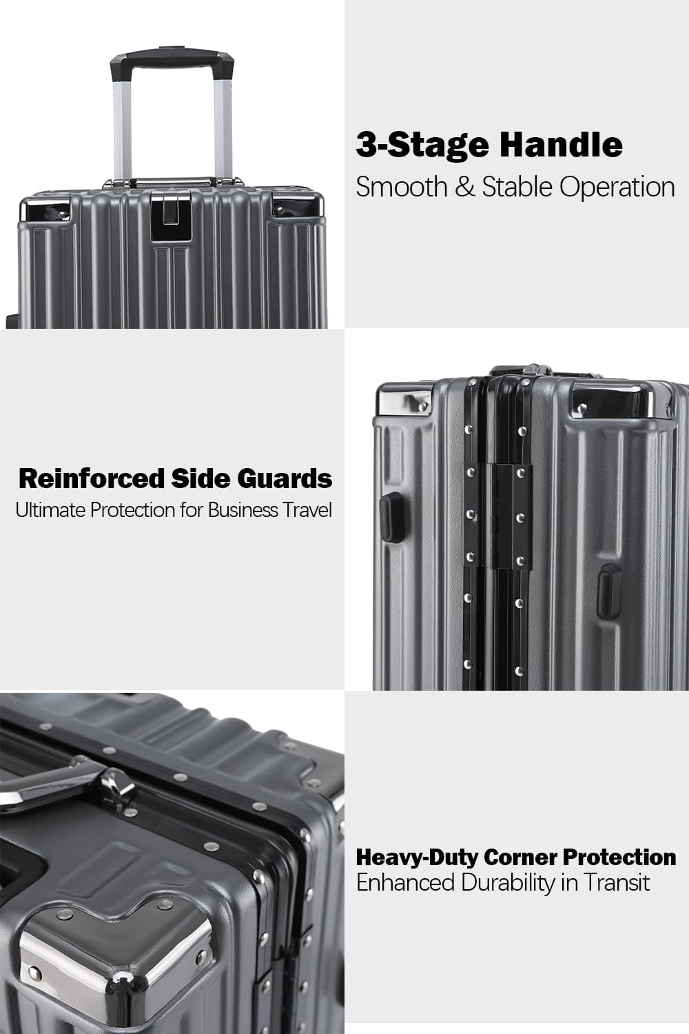 - SECURE ALUMINUM FRAME: Say goodbye to broken zippers with our zipperless hard shell luggage. Featuring a sturdy aluminum frame and easy-to-use latches, this suitcase offers better security and smoother access to your belongings.
