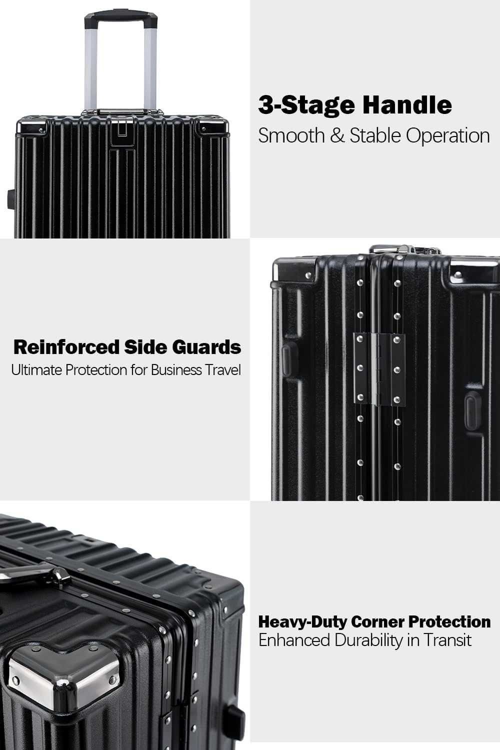 - SECURE ALUMINUM FRAME: Say goodbye to broken zippers with our zipperless hard shell luggage. Featuring a sturdy aluminum frame and easy-to-use latches, this suitcase offers better security and smoother access to your belongings.