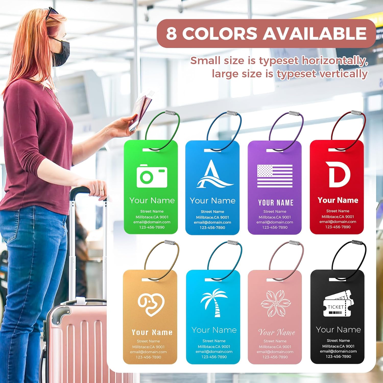 - 8 Available Bright Color: Black, blue, gold, purple, green, pink, red, lake blue for you to choose, Whether business travel for work or family vacations, these custom luggage tags add a pop of color while keeping your belongings secure