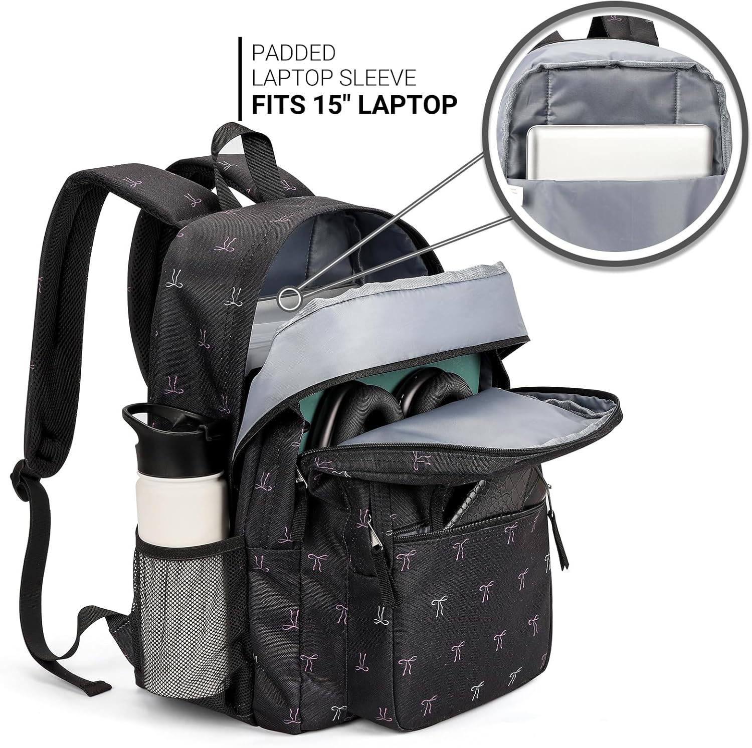 ZORFIN 26L Backpack for College, and Travel: Water Resistant Bookbag - Bow Black