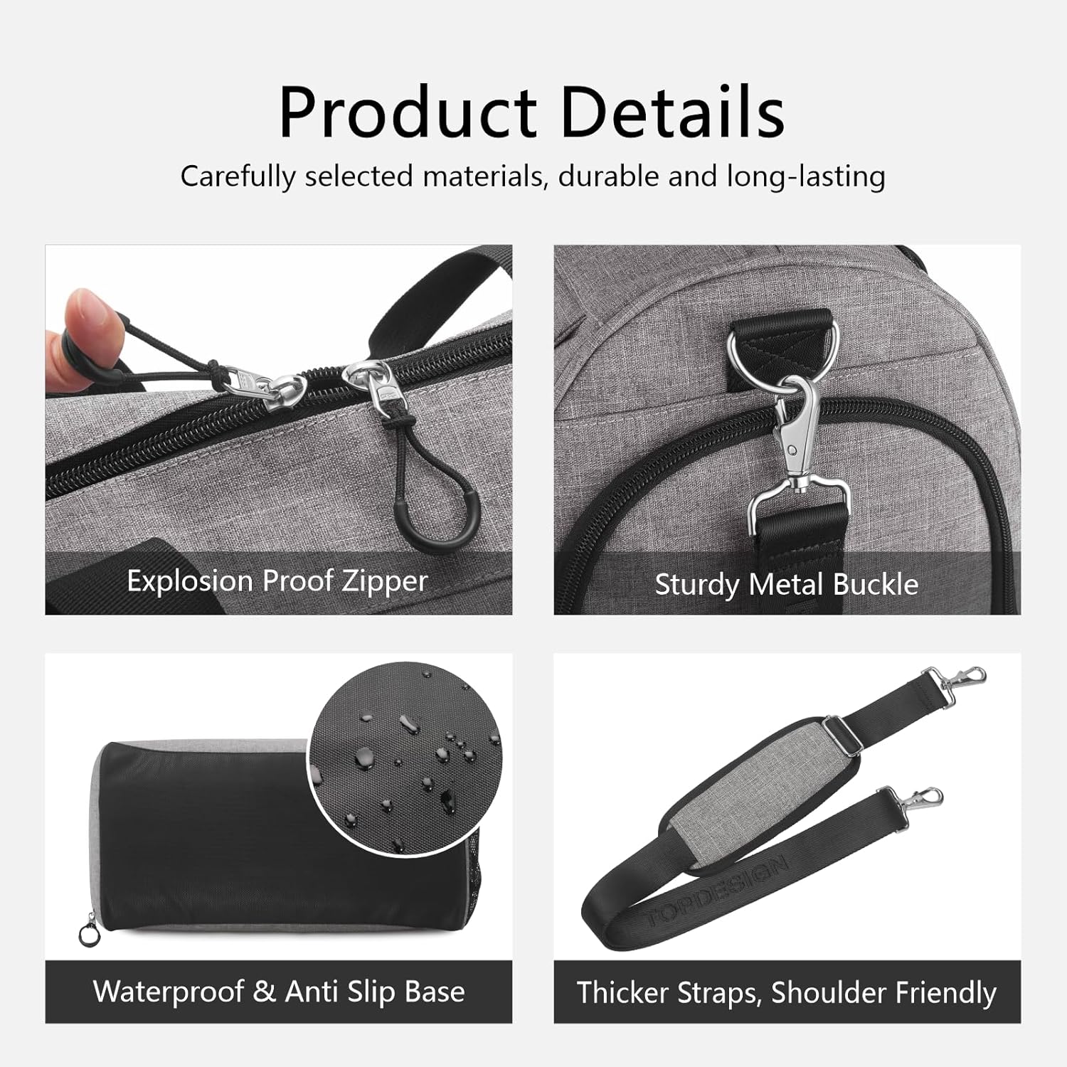 - NO MORE CHAOS: Measures 20 x 10 x 10 inches with 6 pockets, main compartment accommodates all your essentials with ease, a spacious front pocket for undergarments, and a zippered pocket to secure small items. This duffle bag features a ventilated shoe compartment on the right side to separate shoes from clean clothes. And a large waterproof PVC pocket is great for toiletries, swimsuits, and sweaty gym wear. A mesh pocket on the left holds your towels or sports water bottle.
