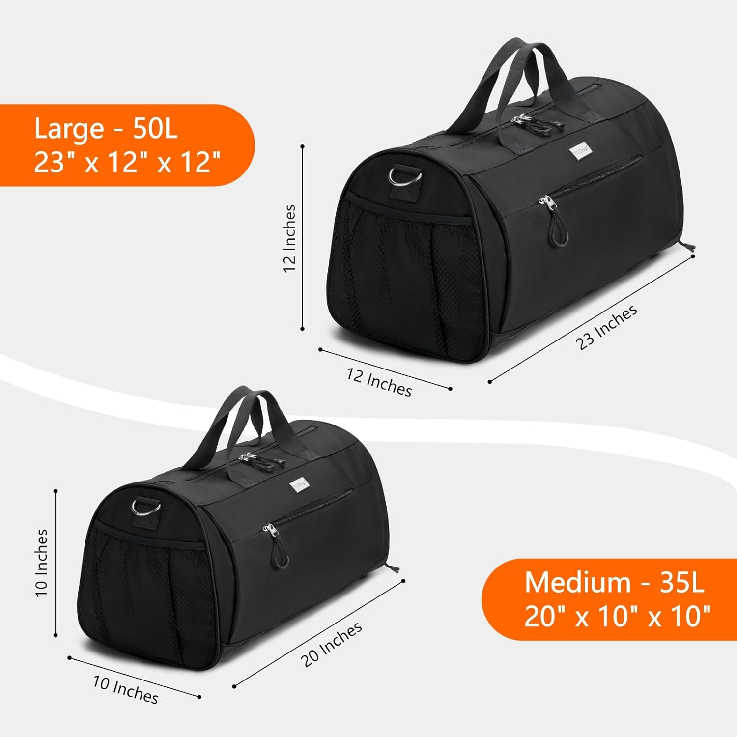 - NO MORE CHAOS: Measures 23 x 12 x 12 inches with 6 pockets, main compartment accommodates all your essentials with ease, a spacious front pocket for undergarments, and a zippered pocket to secure small items. This duffle bag features a ventilated shoe compartment on the right side to separate shoes from clean clothes. And a large waterproof PVC pocket is great for toiletries, swimsuits, and sweaty gym wear. A mesh pocket on the left holds your towels or sports water bottle.
