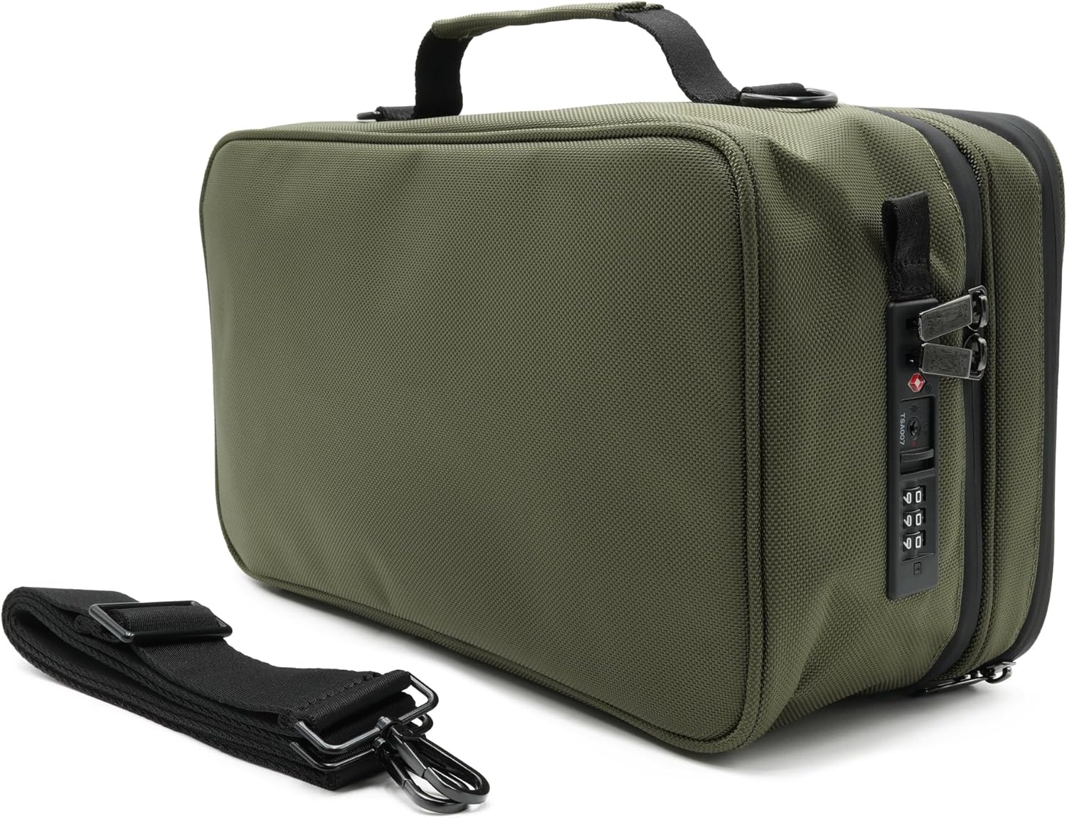 Large Storage Case with TSA Combination Lock Bag, Portable Carbon Lined, XL Medicine Lockable Box for Travel & Home Secured Box Organizer Divider Jars Accessories, Removable Tray (Green)