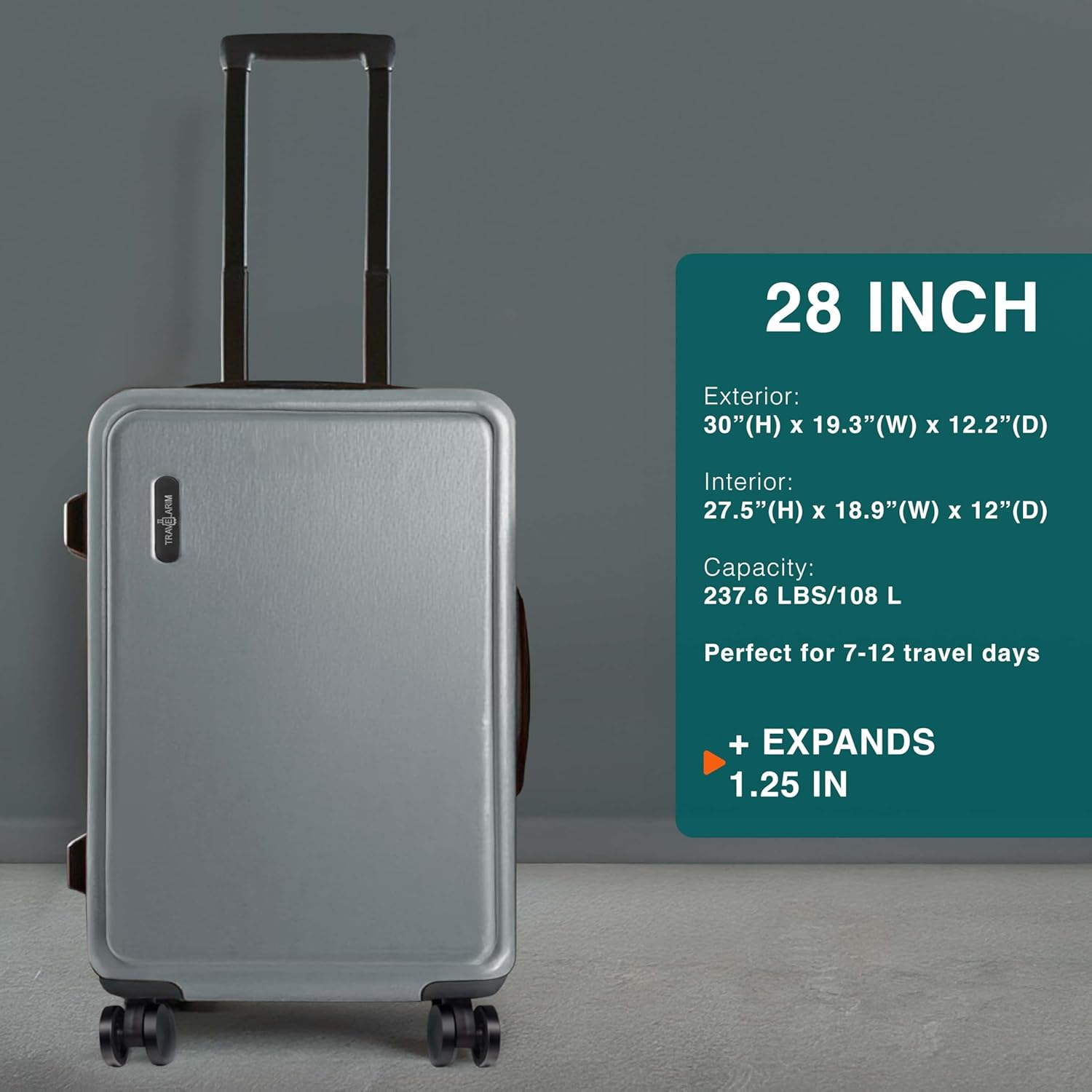 - 28 Inch Luggage: 28” large suitcase: 30” x 19.3” x 12.2” exterior, 27.5” x 18.9” x 12” + 1.25” interior.