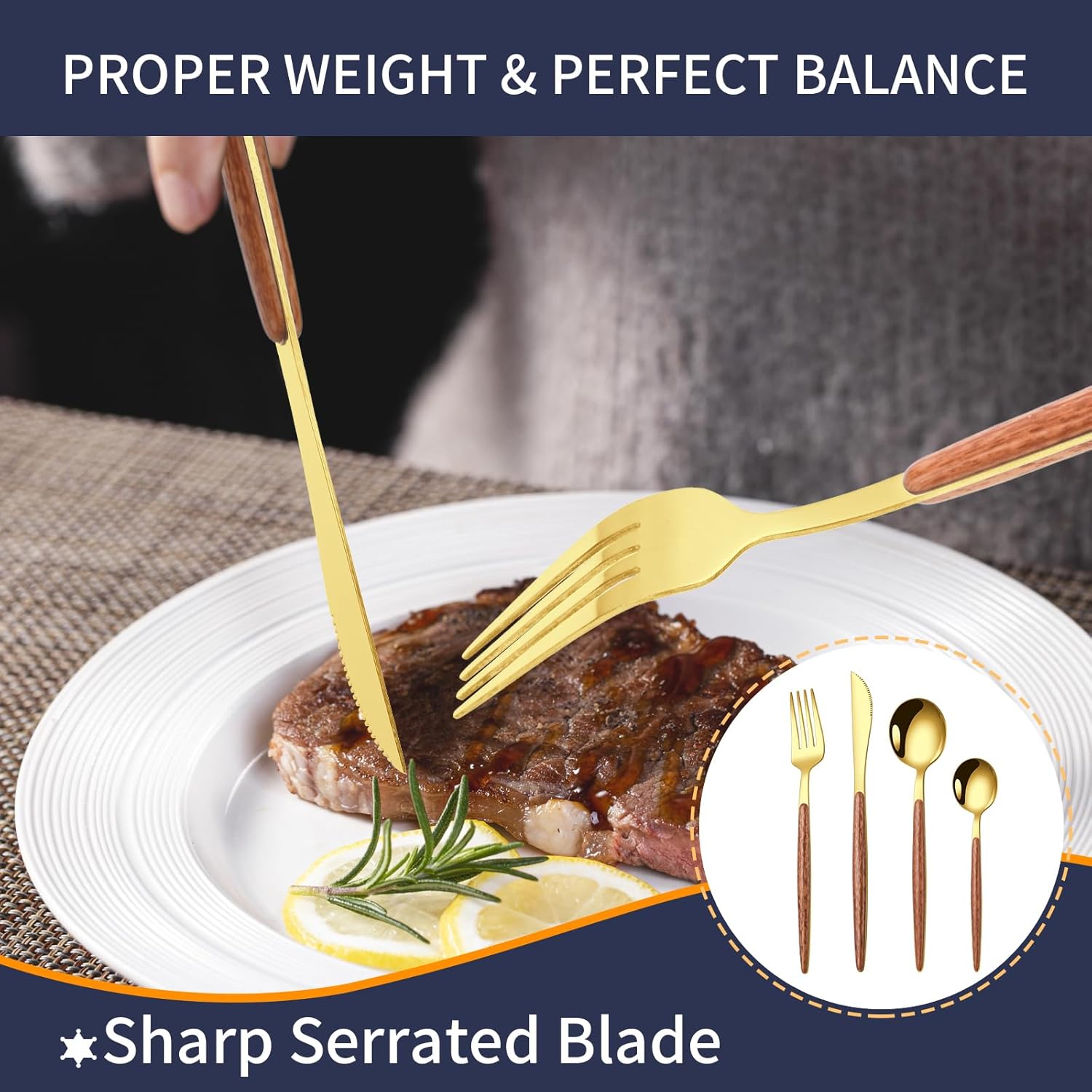 - DISTINCTIVE WOOD-GRAIN HANDLES: The eye-catching gold finish stands out from ordinary silverware, paired with uniquely textured wood-grain handles that create a vintage yet luxurious aesthetic. The smooth surfaces and slim ergonomic design not only enhance its upscale appearance but also prevent hand fatigue during use. For those seeking distinctive tableware, this set is unmissable