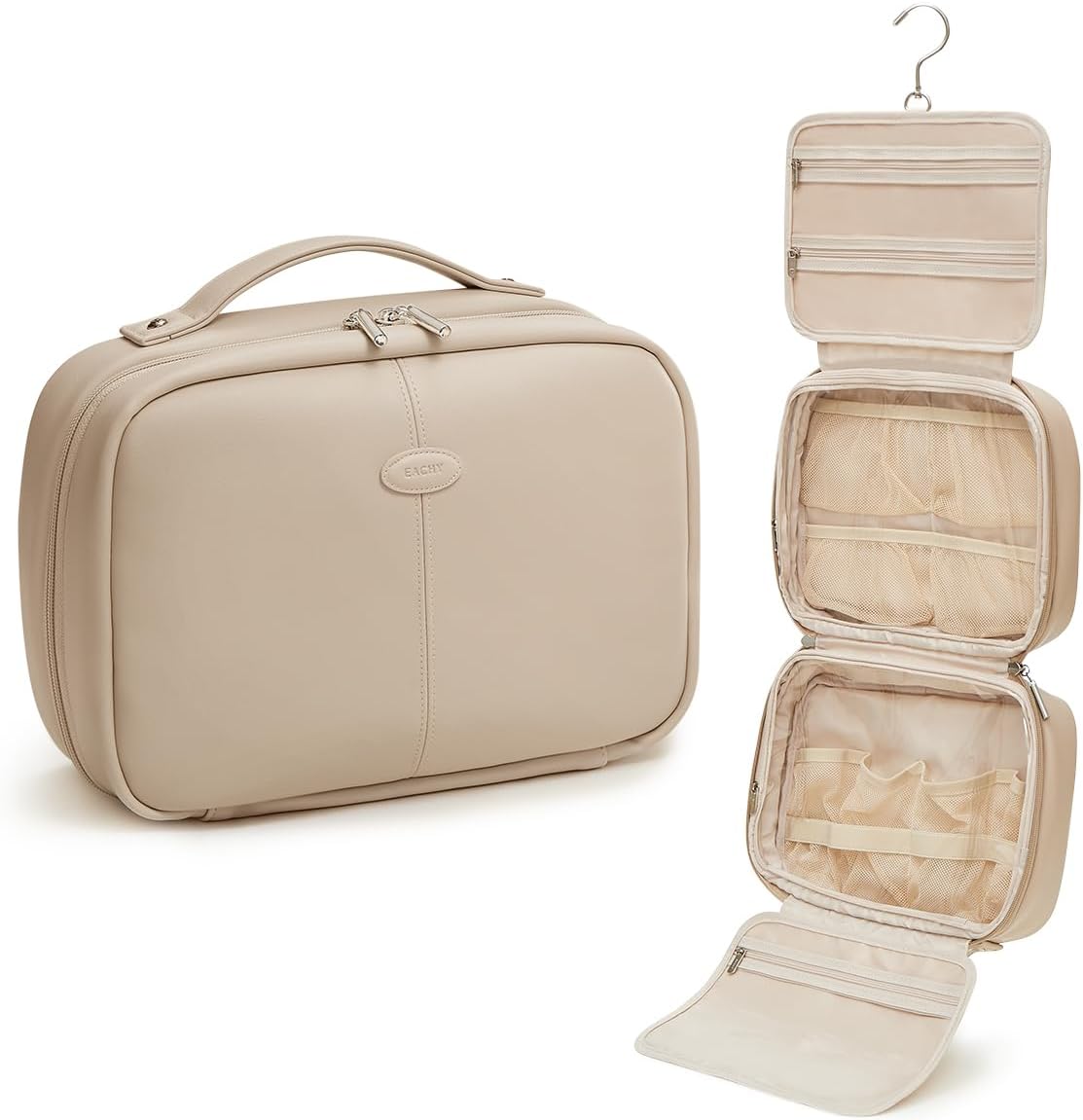 EACHY Toiletry Bag with Hanging Hook, Travel Makeup Bag PU Leather Cosmetic Bags for Women Make Up Organizer with 4 Compartments Waterproof Full-Size Portable Travel Essentials (Trench,Pro)