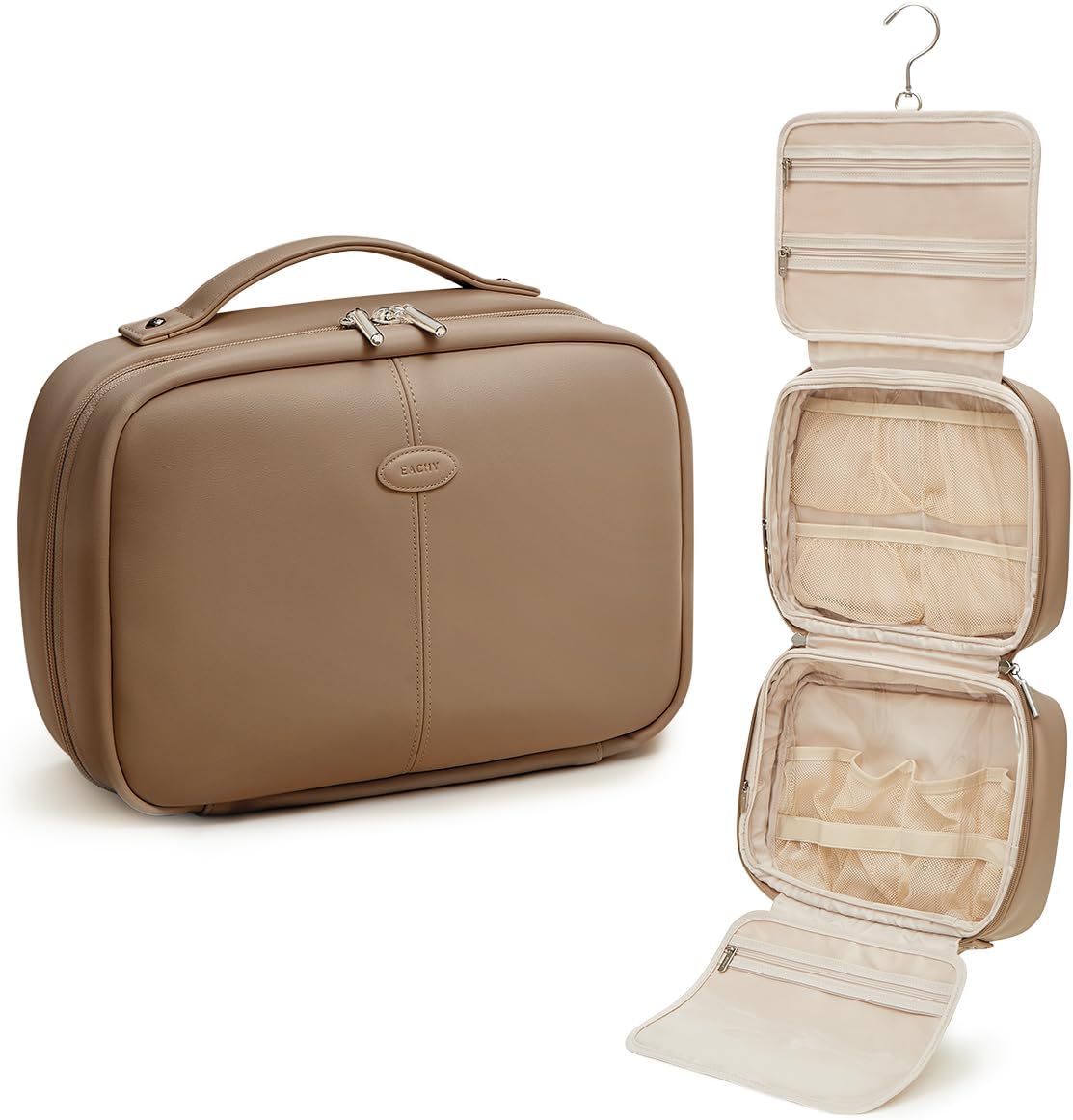 EACHY Toiletry Bag with Hanging Hook, Travel Makeup Bag PU Leather Cosmetic Bags for Women Make Up Organizer with 4 Compartments Waterproof Full-Size Portable Travel Essentials (Etoupe Grey-Pro)
