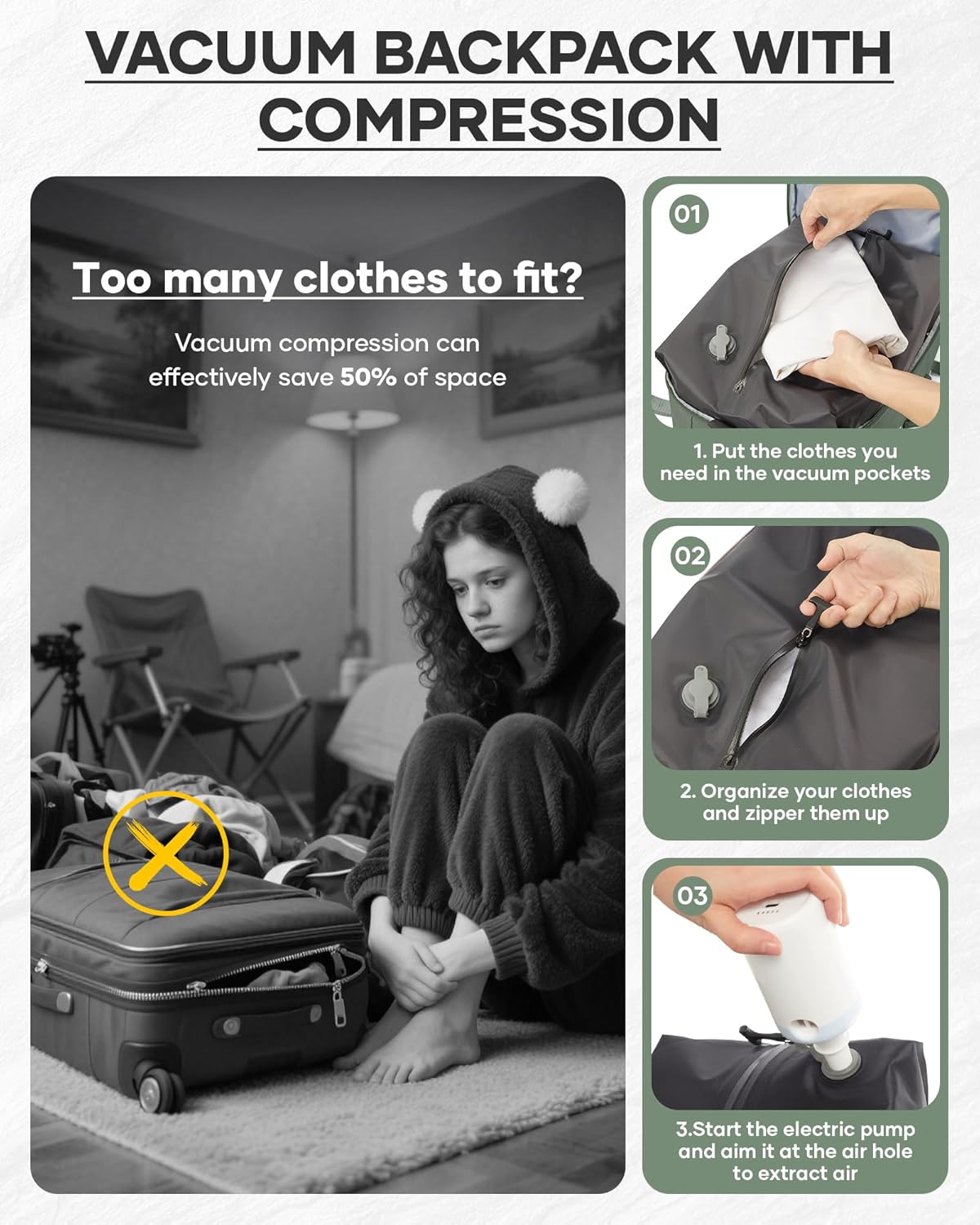 - Ease The Burden: The vacuum pockets isolate your items from the outside world, effectively preventing dust, moisture, etc. from entering and keeping your items clean and hygienic, which is especially suitable for long-distance travel and use in complex environments. As items are compressed, the overall volume and weight of the backpack can be reduced for the same backpack capacity, thus reducing the burden on the traveler's back and making traveling easier.