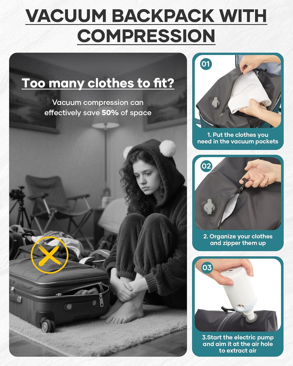 - Ease The Burden: The vacuum pockets isolate your items from the outside world, effectively preventing dust, moisture, etc. from entering and keeping your items clean and hygienic, which is especially suitable for long-distance travel and use in complex environments. As items are compressed, the overall volume and weight of the backpack can be reduced for the same backpack capacity, thus reducing the burden on the traveler's back and making traveling easier.