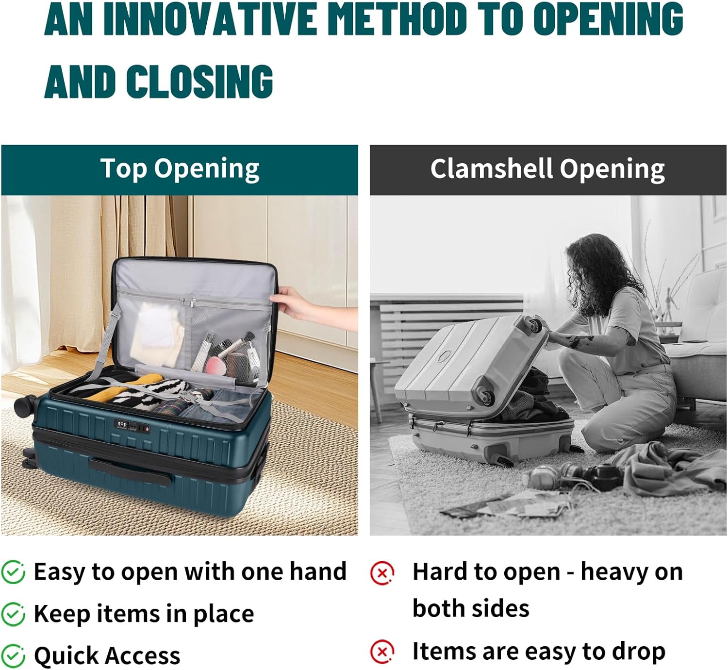 - 3-Piece Set: Set includes one 20“ airline-approved carry-on top-open suitcase, one 24” top-open checked suitcase, and one 28" clamshell open large suitcase. 20'‘ and 24’' feature an innovative side-opening design with a 1:9 layout and top opening mechanism allowing for effortless one-handed access and keep item in place.