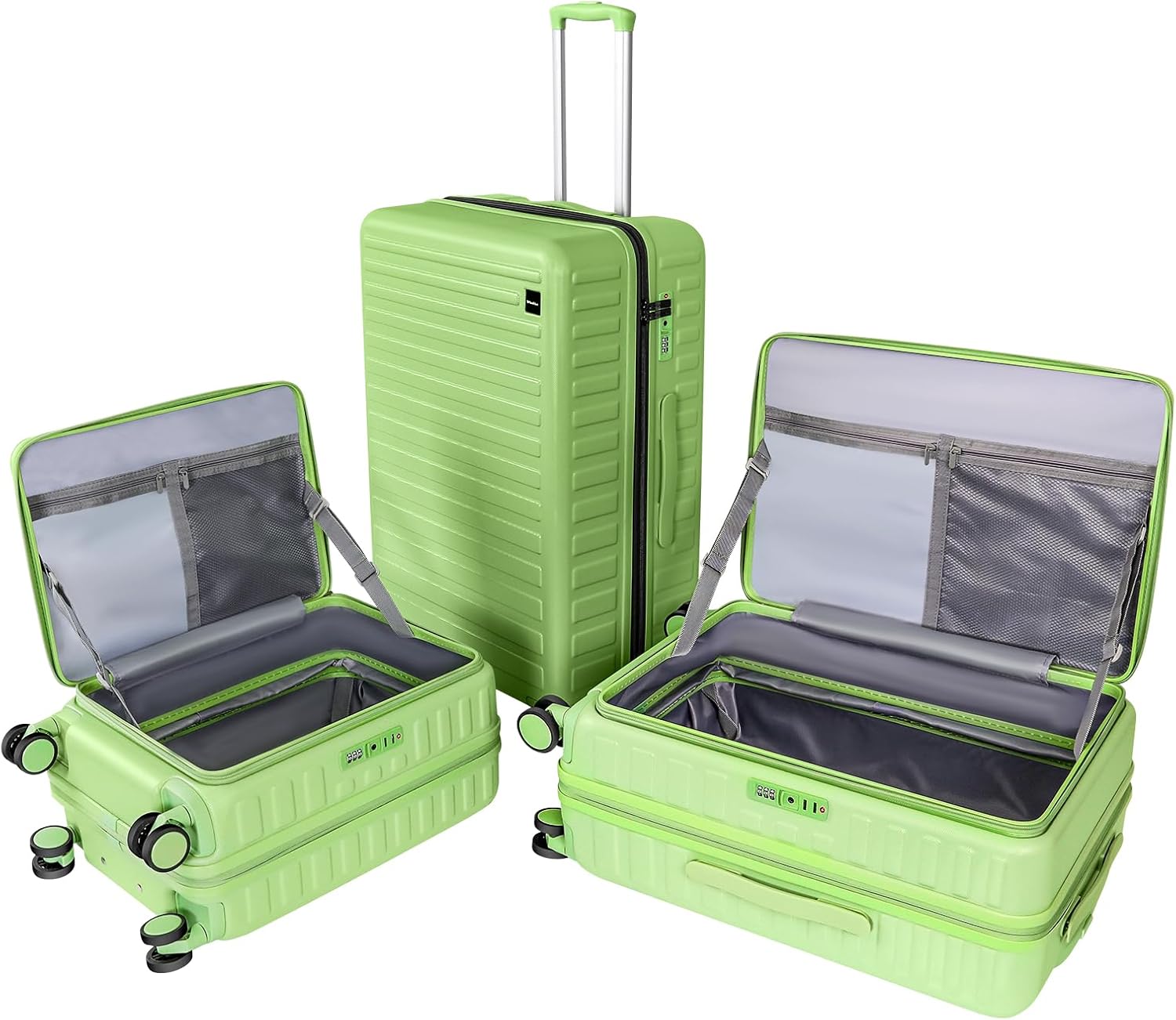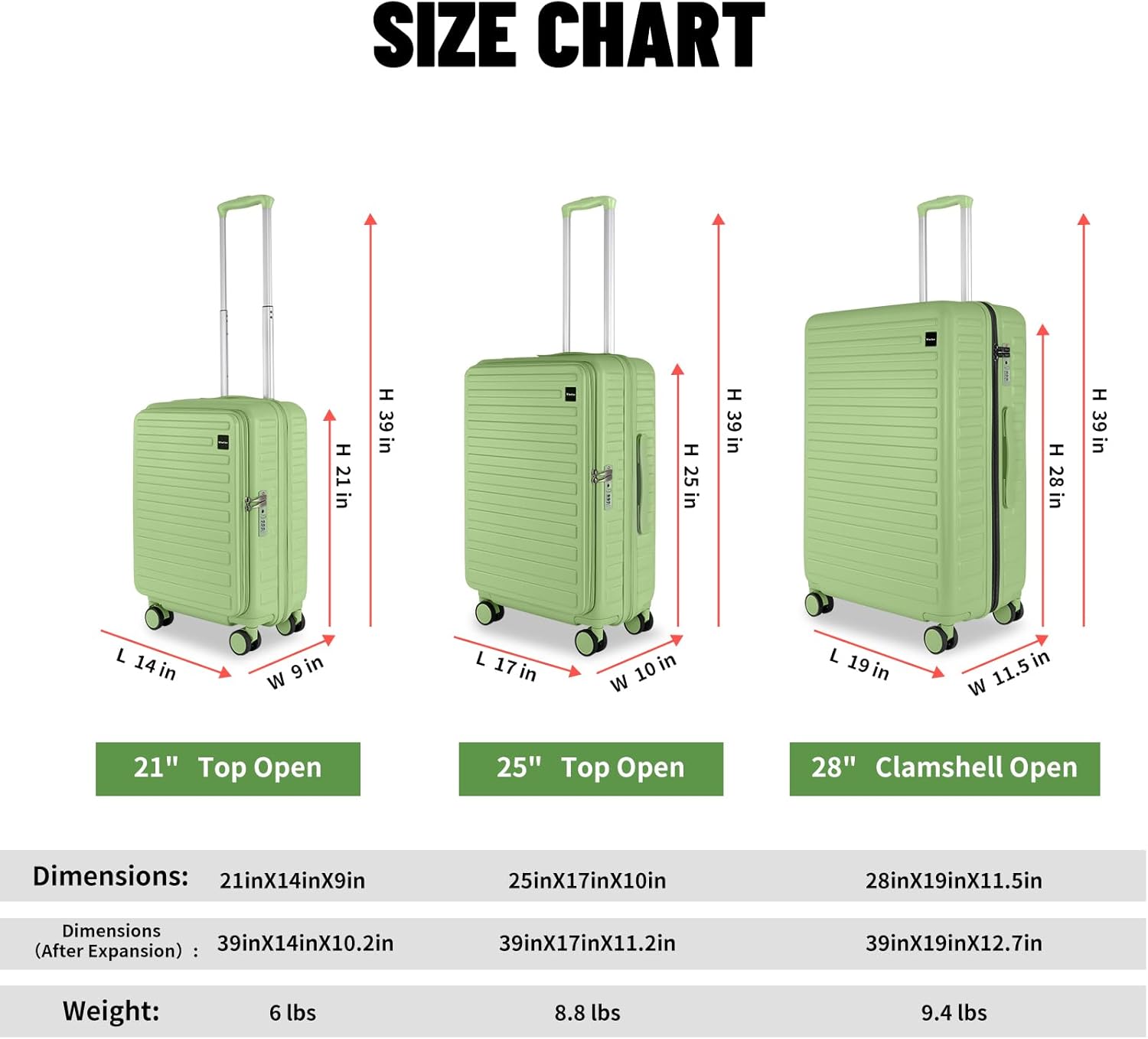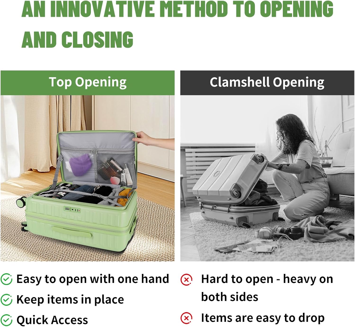 - 3-Piece Set: Set includes one 20“ airline-approved carry-on top-open suitcase, one 24” top-open checked suitcase, and one 28" clamshell open large suitcase. 20'‘ and 24’' feature an innovative side-opening design with a 1:9 layout and top opening mechanism allowing for effortless one-handed access and keep item in place.