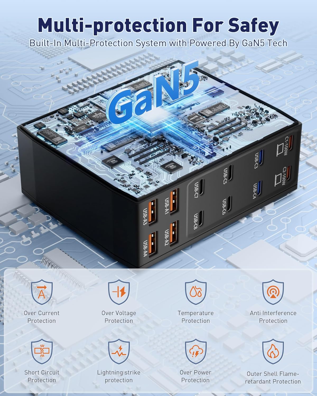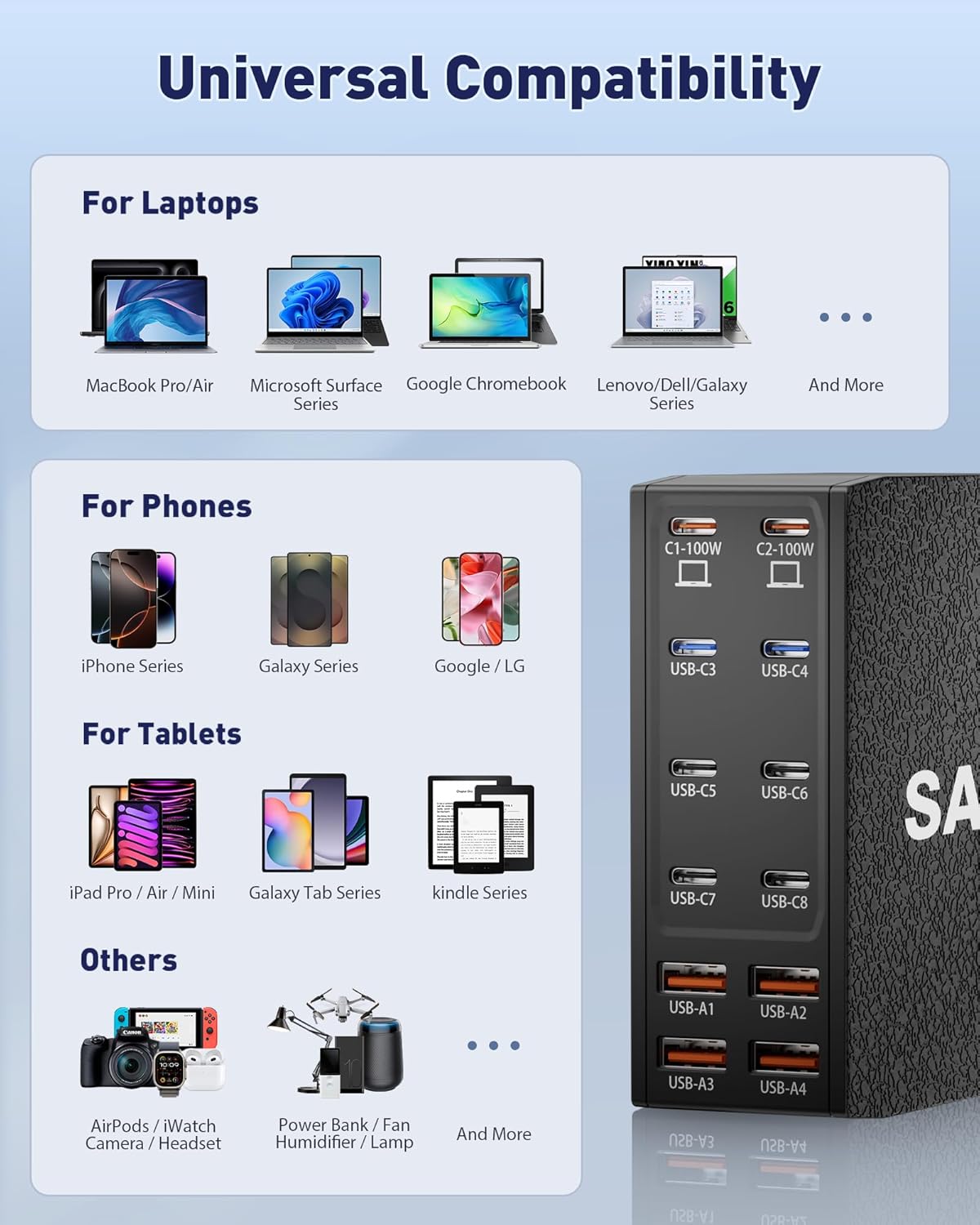 - 【Universal Compatibility】Our USB C charging station is equipped with 2*100W and 2*65W fast charging ports, which can charge 3 or more laptops at the same time. Compatible with smartphones, tablets and laptops, suitable for MacBook Pro/Air, Dell XPS, iPad Pro, Phone 16/16 Pro Max, Phone 15 Pro Max, Phone 14/13 Pro/12 Pro Max, iWatch, AirPods, Surface Pro, Galaxy S24 Ultra, Switch, Steam Deck, Google Pixel and many other devices.