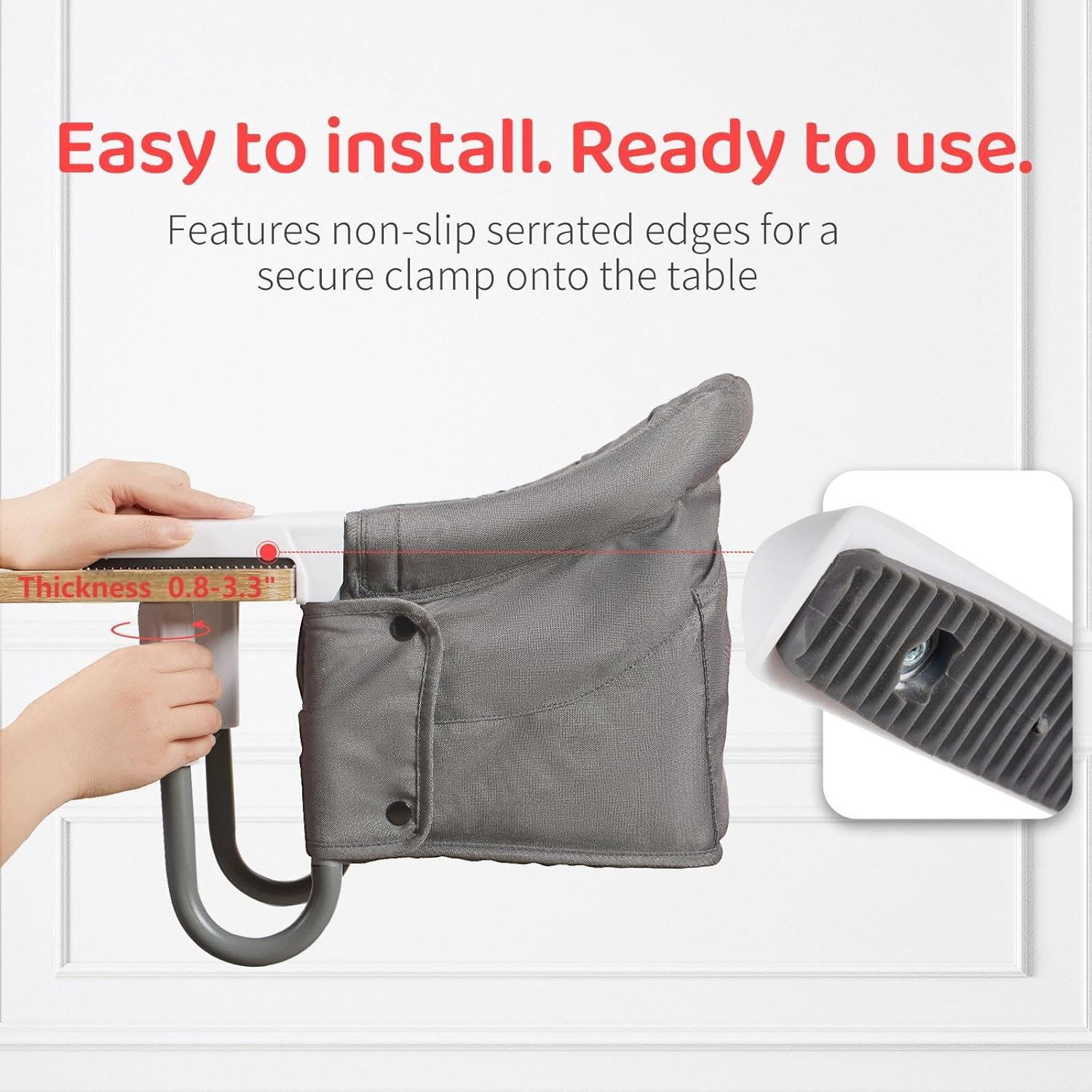 - EASY INSTALLATION:This table high chair features instant clip-on design that securely attaches to most tables (0.8"-3.3" thick) within seconds. The table chair for baby requires no tools - simply adjust the heavy-duty clamps for rock-solid stability. Perfect for dining out, this fast table chair for baby makes setup effortless anywhere.