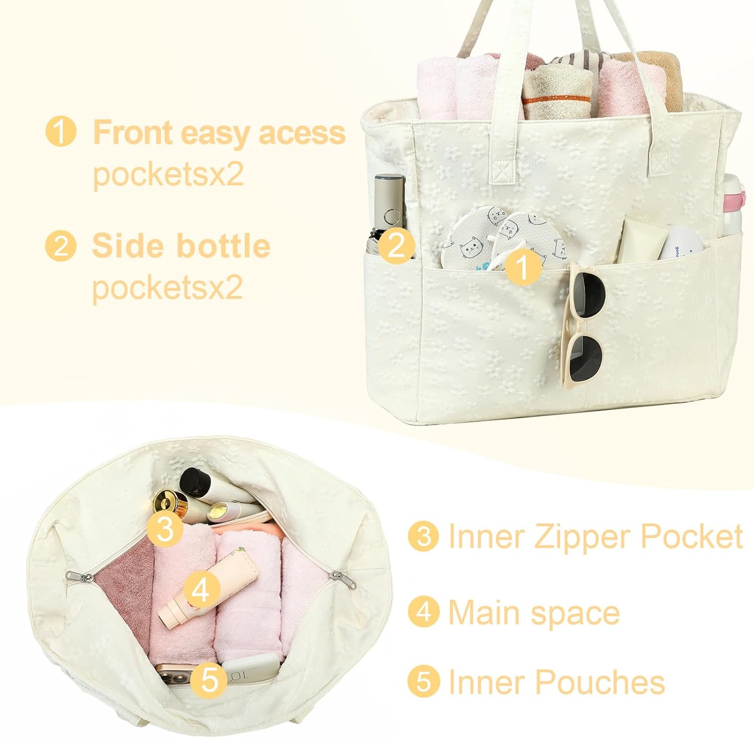 - Separate wet compartment: Unlike other beach tote bag, this one is up-graded with separate waterproof wet compartment which you can put into some wet stuff Toiletries, wet swimsuit and towels, keep other items dry all the day.