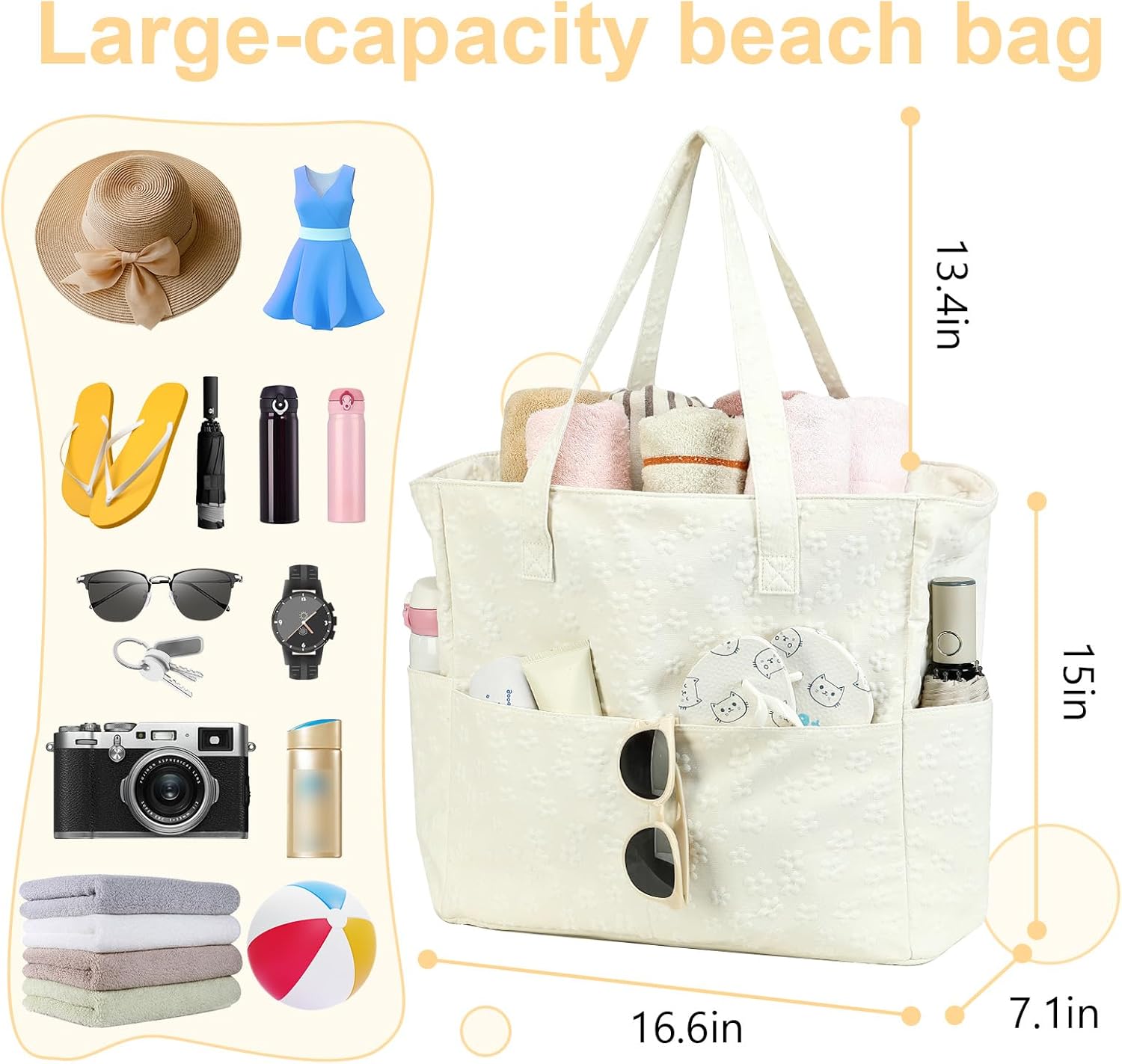 - Large beach bag with Multiple pockets: 17.5*15.7*8 inches (LxHxW), with 36 L capacity, the big main compartment can fit all the essentials for your family (3-4 families member), like change of clothes, sandals, beach towels, swimsuit, water bottles, still can utilize the 4 pockets outside and 2 inner pockets for extra essentials (water bottles, sand toy, snacks, sun glasses etc.)