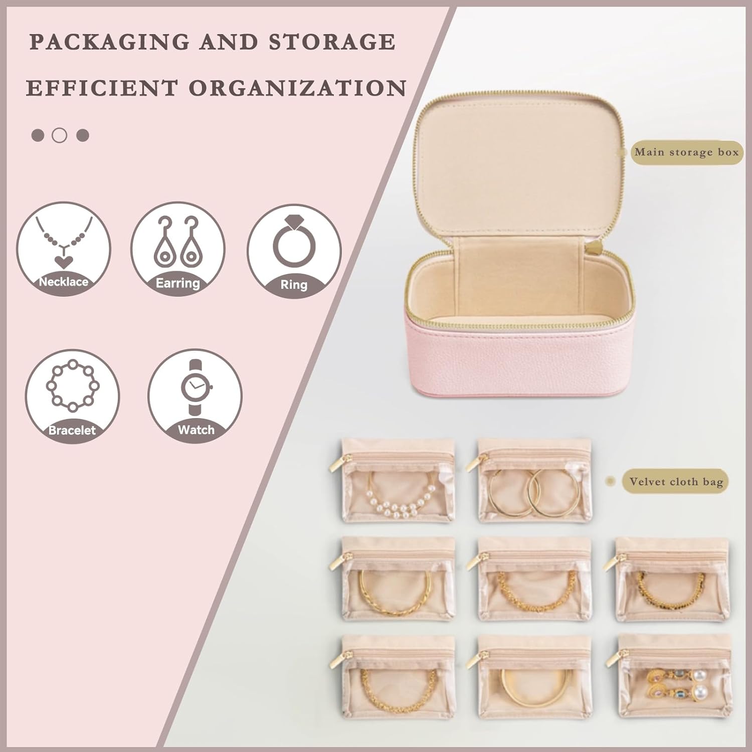 Jewelry Box Organizer for Women,Small Travel Jewelry Case,Mini Travel Jewelry Organizer with 8 Velvet Jewelry Zipper Pouches, Jewelry Box Organizer for Christmas Birthday(Pink)