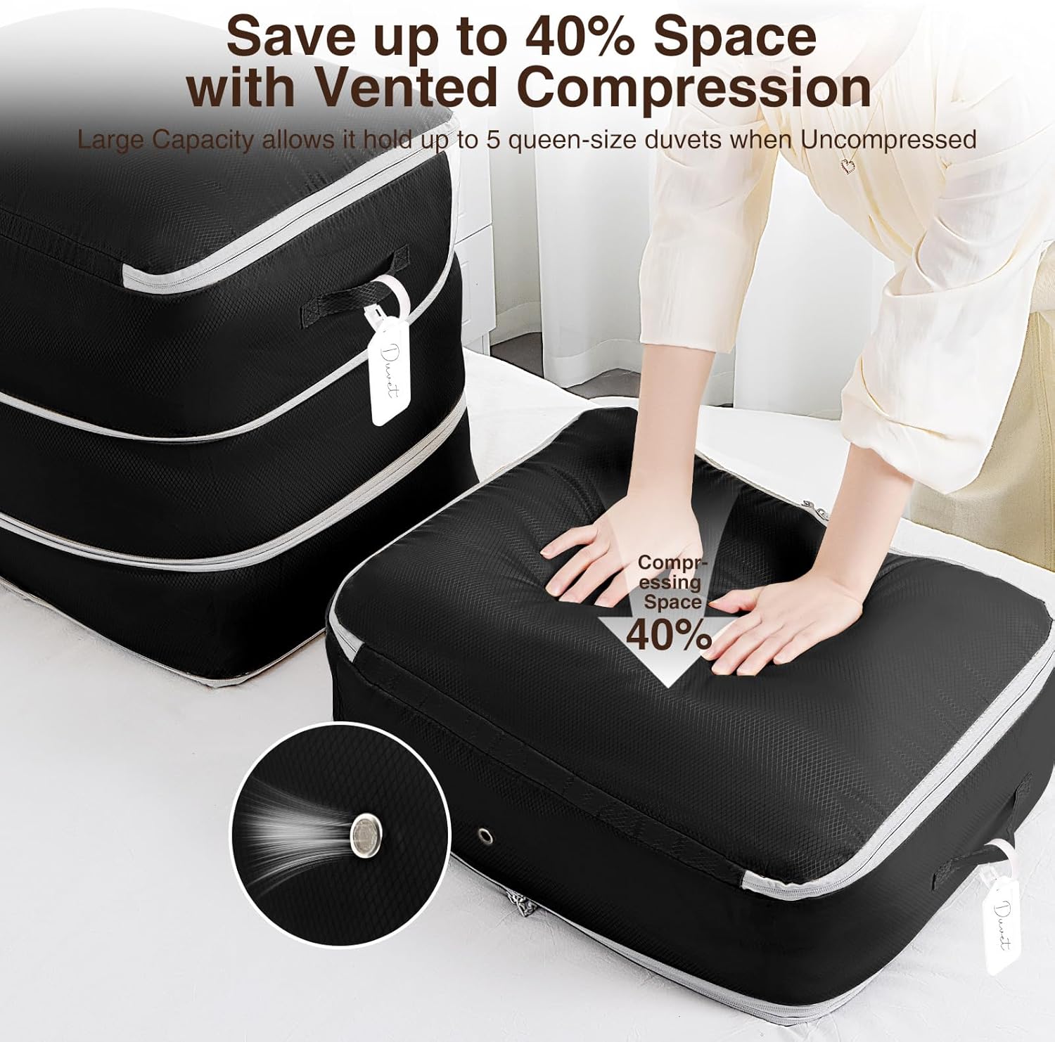 - [Large-Capacity Versatile Storage]: These compression clothing storage bags are ideal for storing comforters, blankets, winter coats, down jackets, sweaters, pillows, bed sheets, towels, scarves, and even seasonal clothing, adapting to all your storage needs. From bulky duvets to lightweight quilts, they accommodate a wide range of items. The ultra space saving self compression design maximizes closet or under-bed space, keeping everything compact, organized, and protected