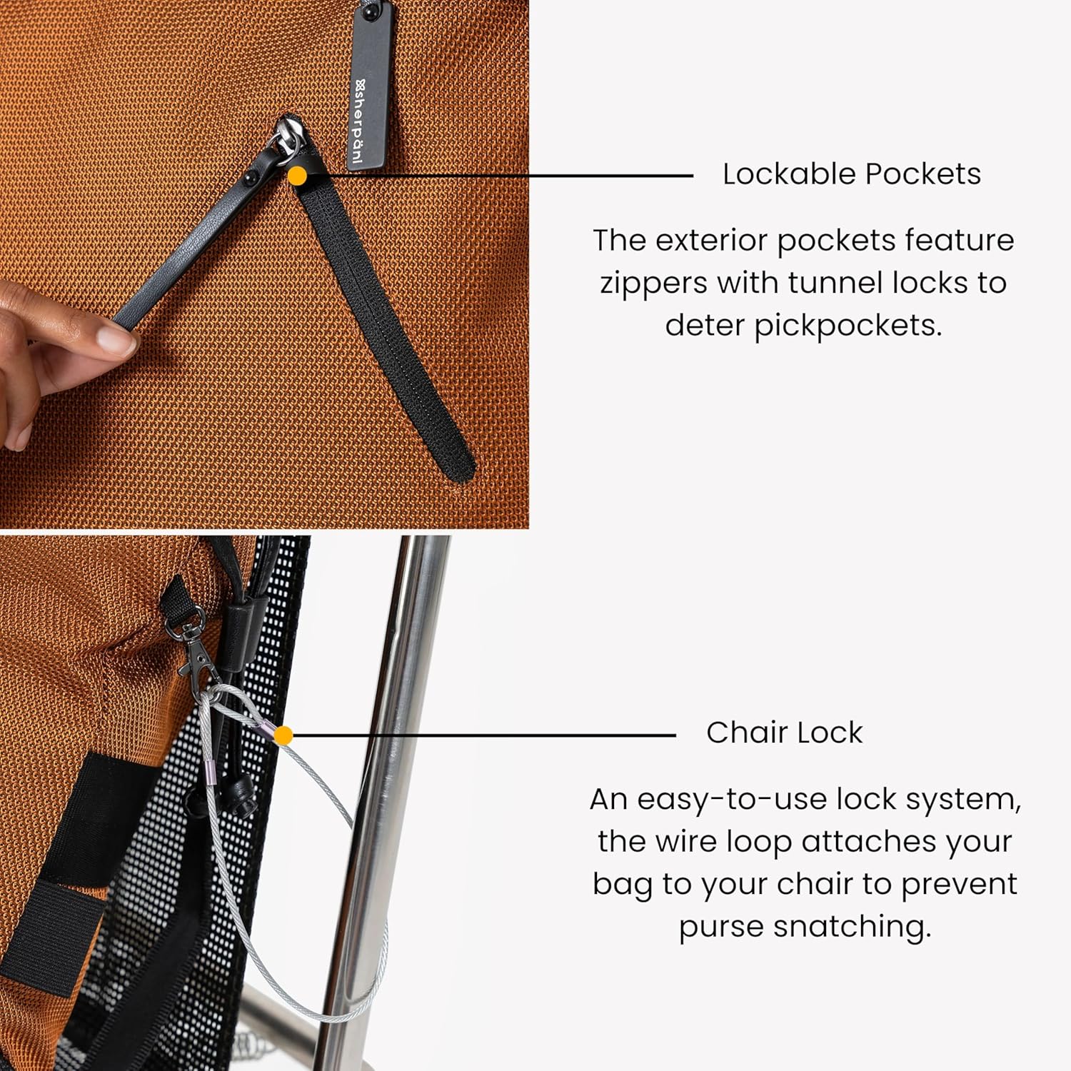 - ANTI THEFT FEATURES - This bag is equipped with RFID protection, one exterior zipper lock tunnel, a clip lock for the main compartment opening, and a chair loop lock system. The bottom of the bag is lined with anti-slash fabric and the main strap is also slash proof.