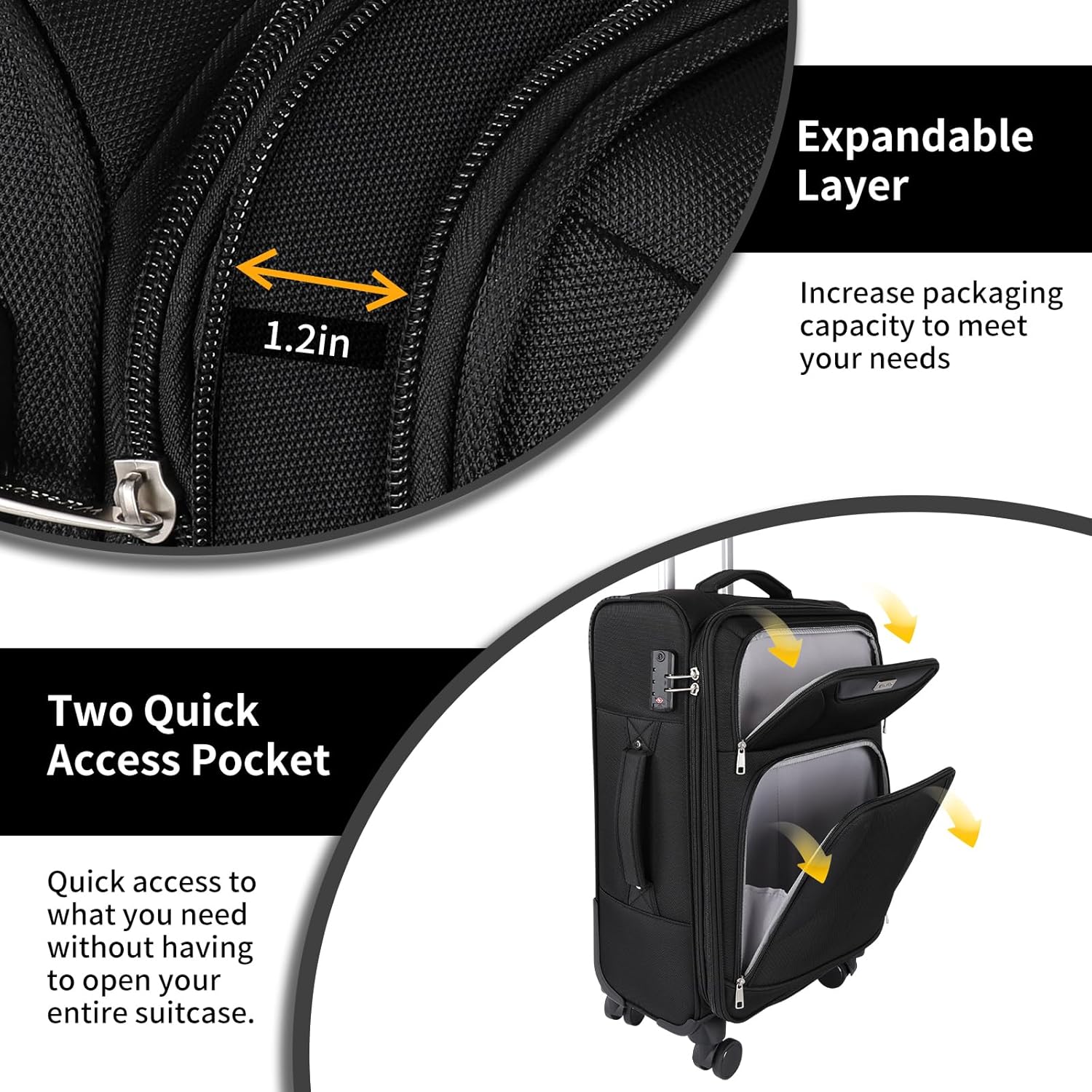 - Top Softside 3-Piece Luggage Set: Set contains a carry-on 20" luggage, a 24" checked suitcase, and a 28" large luggage. Each suitcase is equipped with a 1.2-inch expansion feature and two front open pockets, allowing for quick access to items and providing additional storage space as needed.