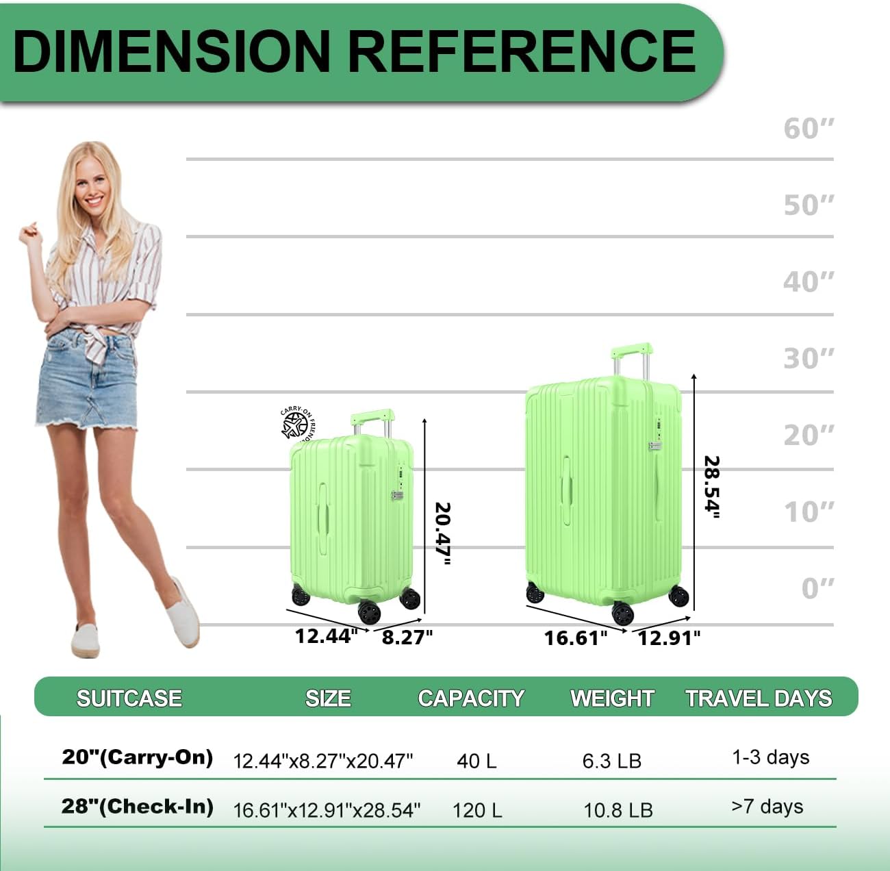 - 【Affordable Luggage Sets】A suit consisting of two boxes of 20 and 28 inches, respectively satisfying: boarding, travel, daily storage,business travel and other functions. 20-inch suitcase can be brought on the plane directly without checking it.20inch: 40L 20:12.44*8.27*20.47 IN,6.3LB. 28inch: 120L 28:16.61*12.91*28.54 IN,10.8LB