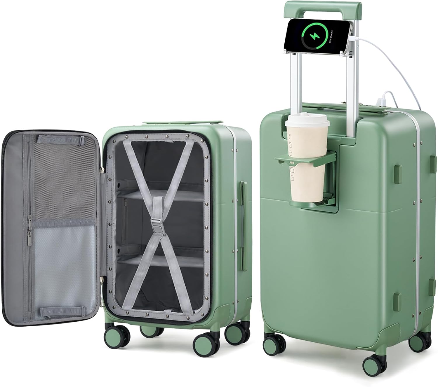 Hanke 28 Inch Luggage with Cup Holder and Charge,Top Opening Hard Shell Suitcases with Wheels and Dividers,Aluminum Frame Trunk Luggage Extra Large Suitcase with Lock for Travel,Forest Green